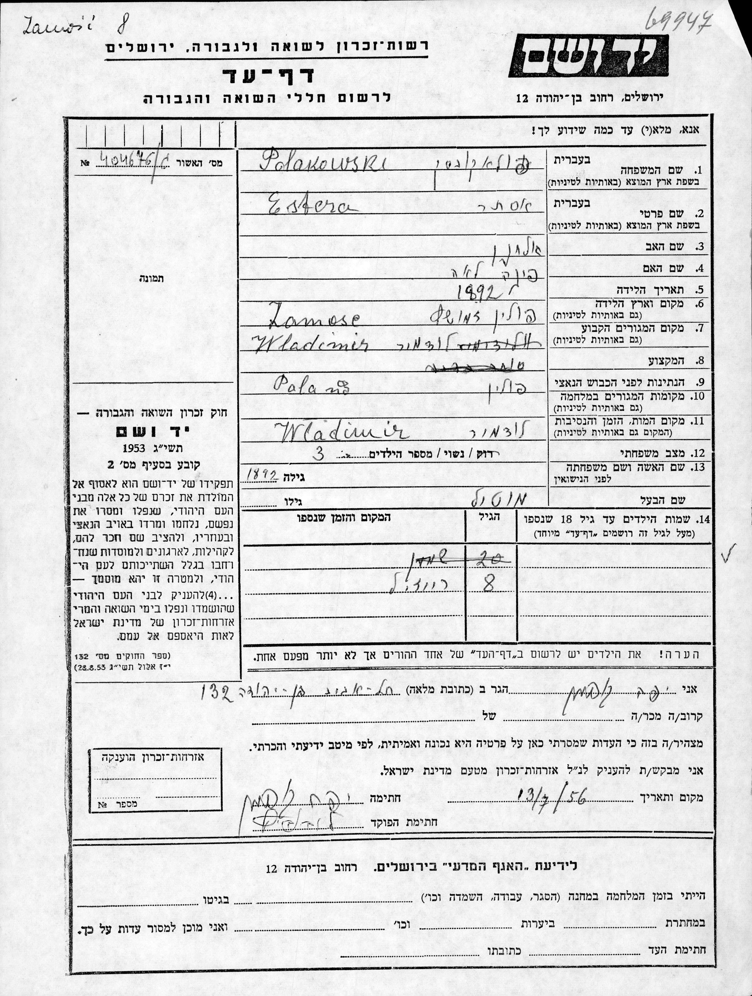 Polakowski Reizl Wladimir Wolynski, Pologne Feuille de témoignage