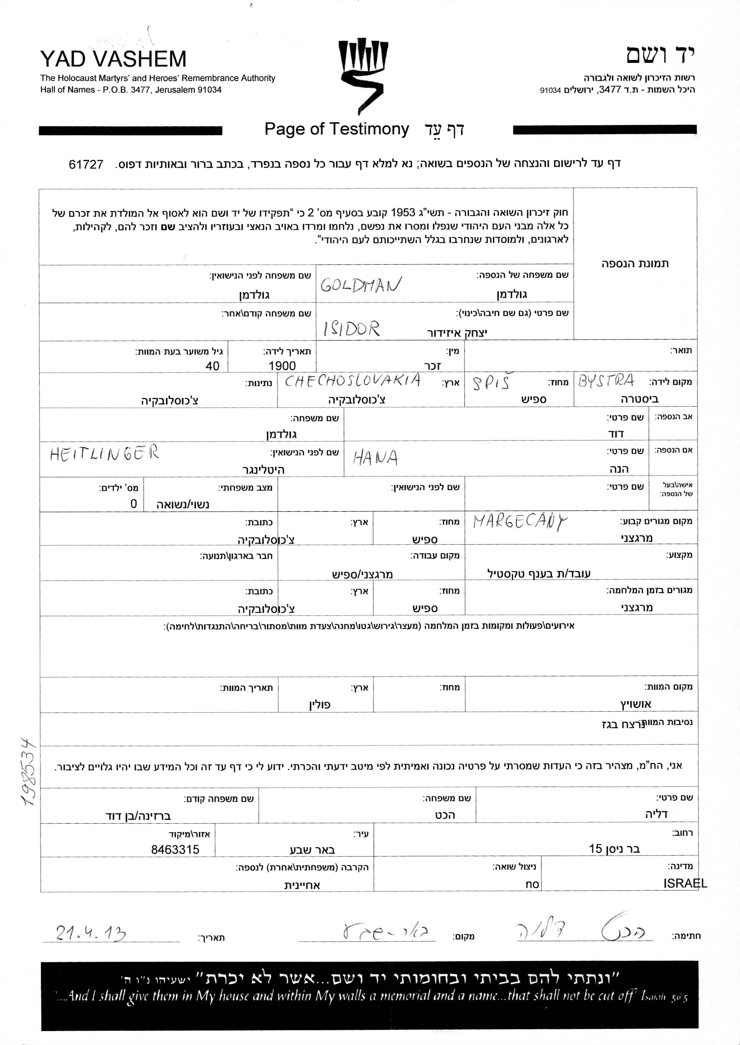 Goldman Yitzkhak Izidor 1900 Margecany, Tchécoslovaquie Feuille de témoignage (digitale-signée)