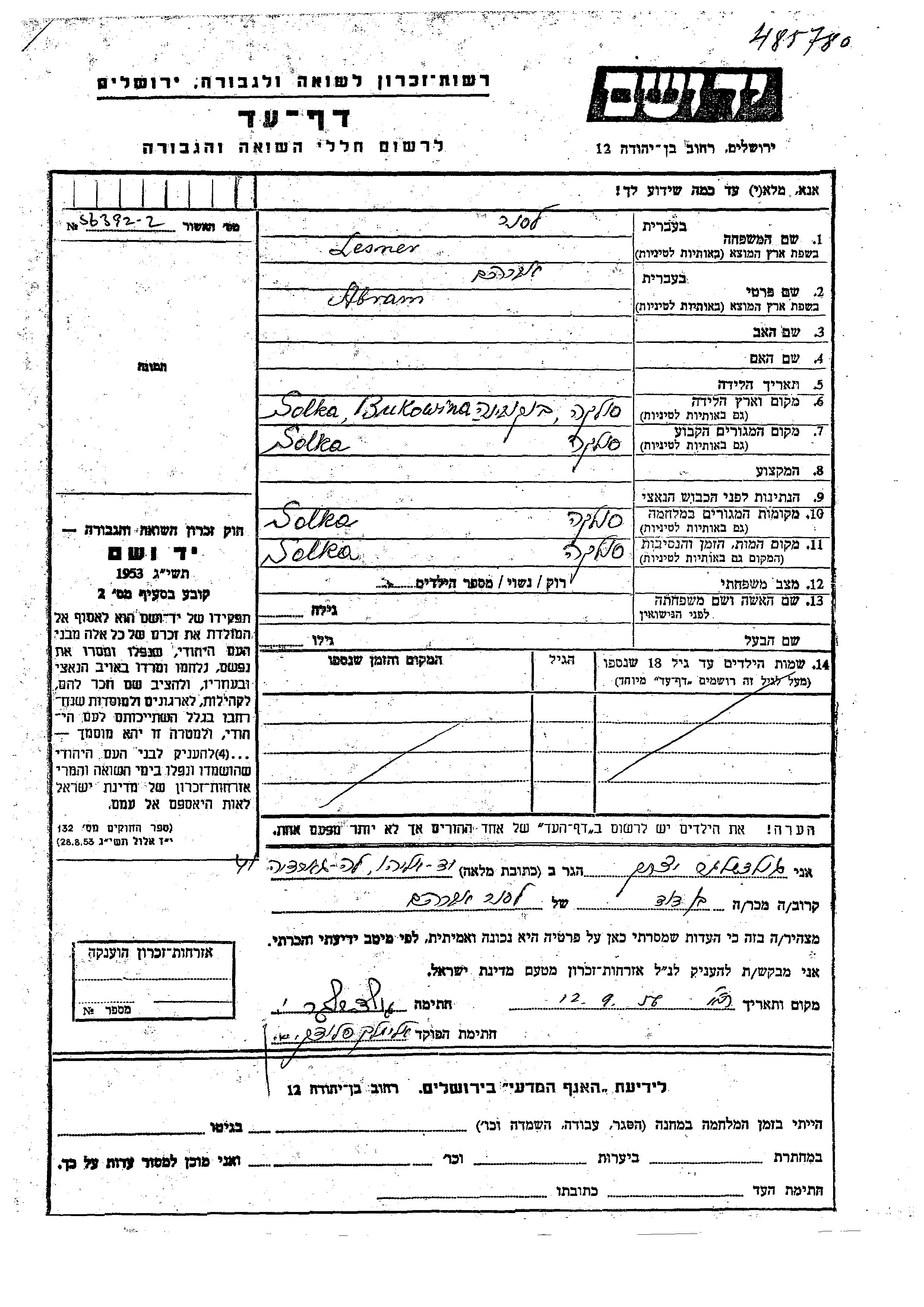 Lesner Abram Solka, Roumanie Feuille de témoignage