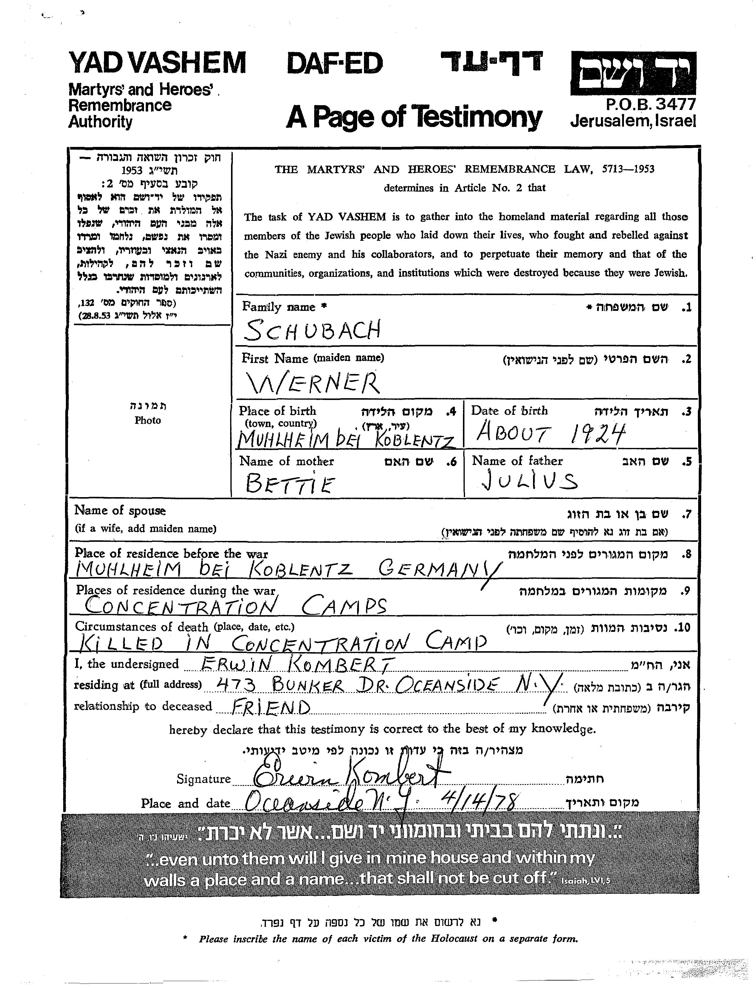 Werner Schubach est né à Muelheim, Allemagne en 1924, fils de Julius et de Bettie. Avant la seconde guerre mondiale il vivait à Muelheim, Allemagne. Au cours de la guerre, il était à Camp.