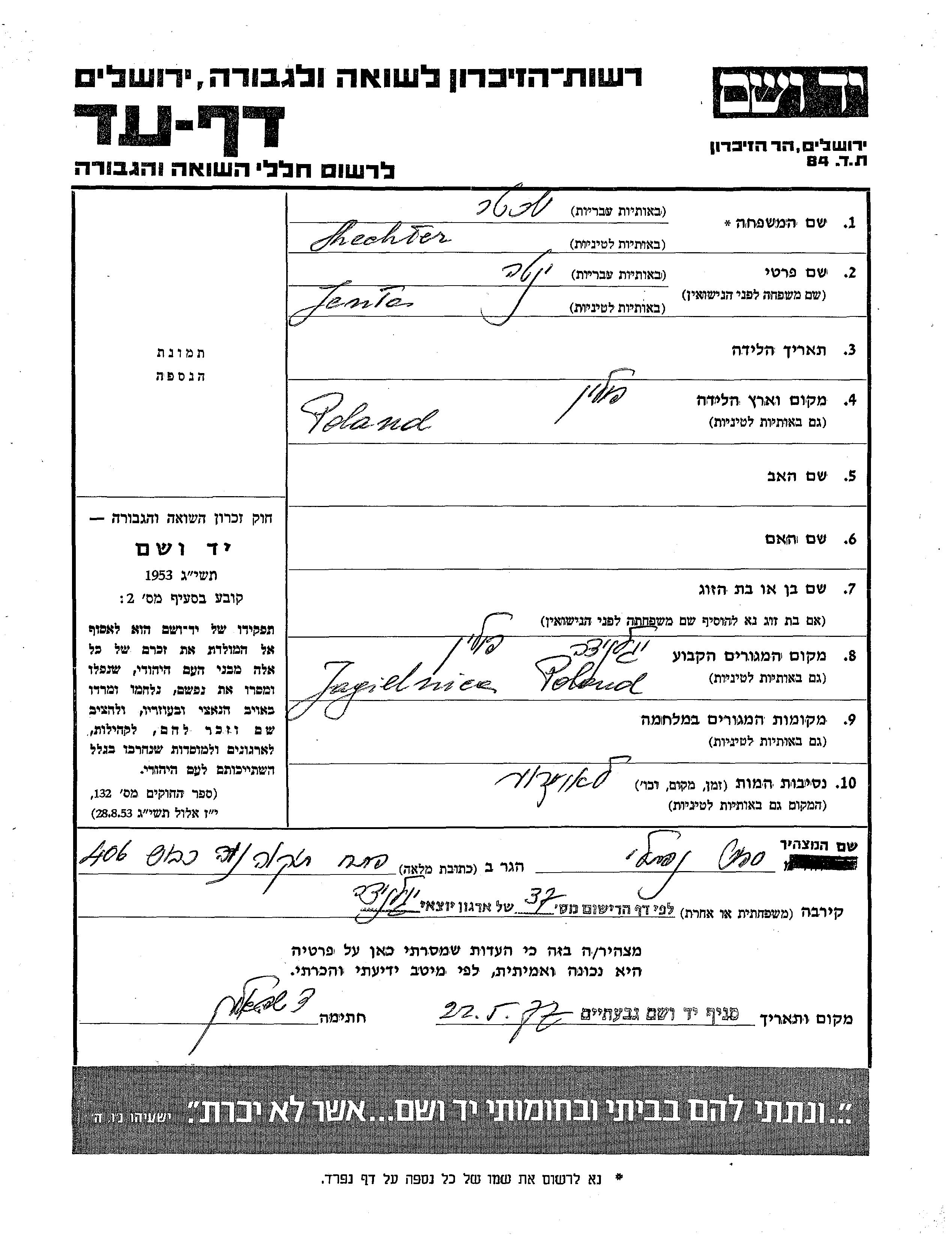 Shechter Jenta Jagielnica, Pologne Feuille de témoignage