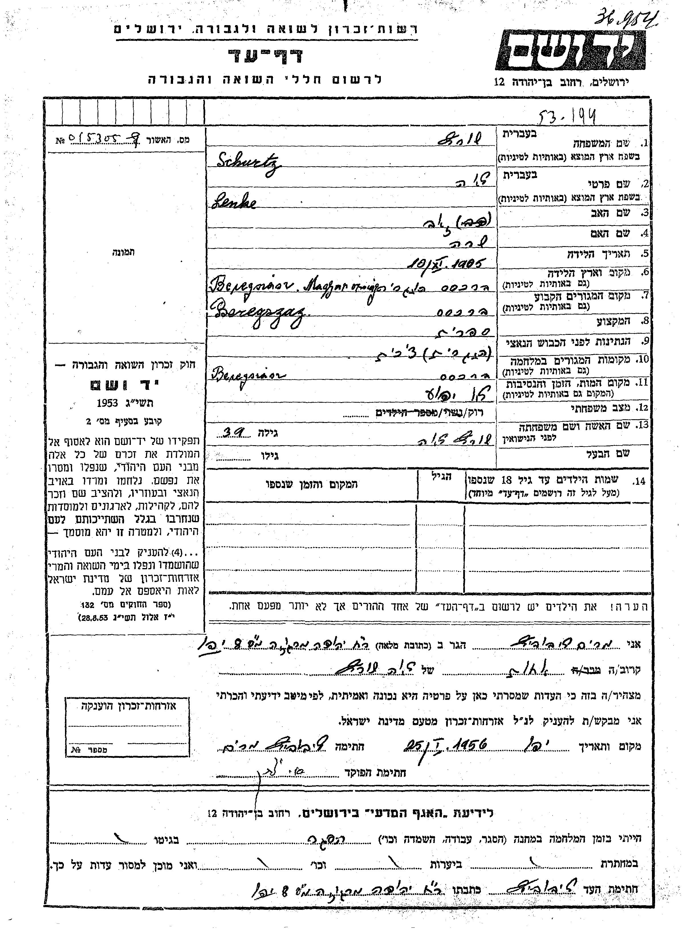 Schurtz Shvartz Lenke Lea 1905 Beregszasz, Tchécoslovaquie Feuille de témoignage