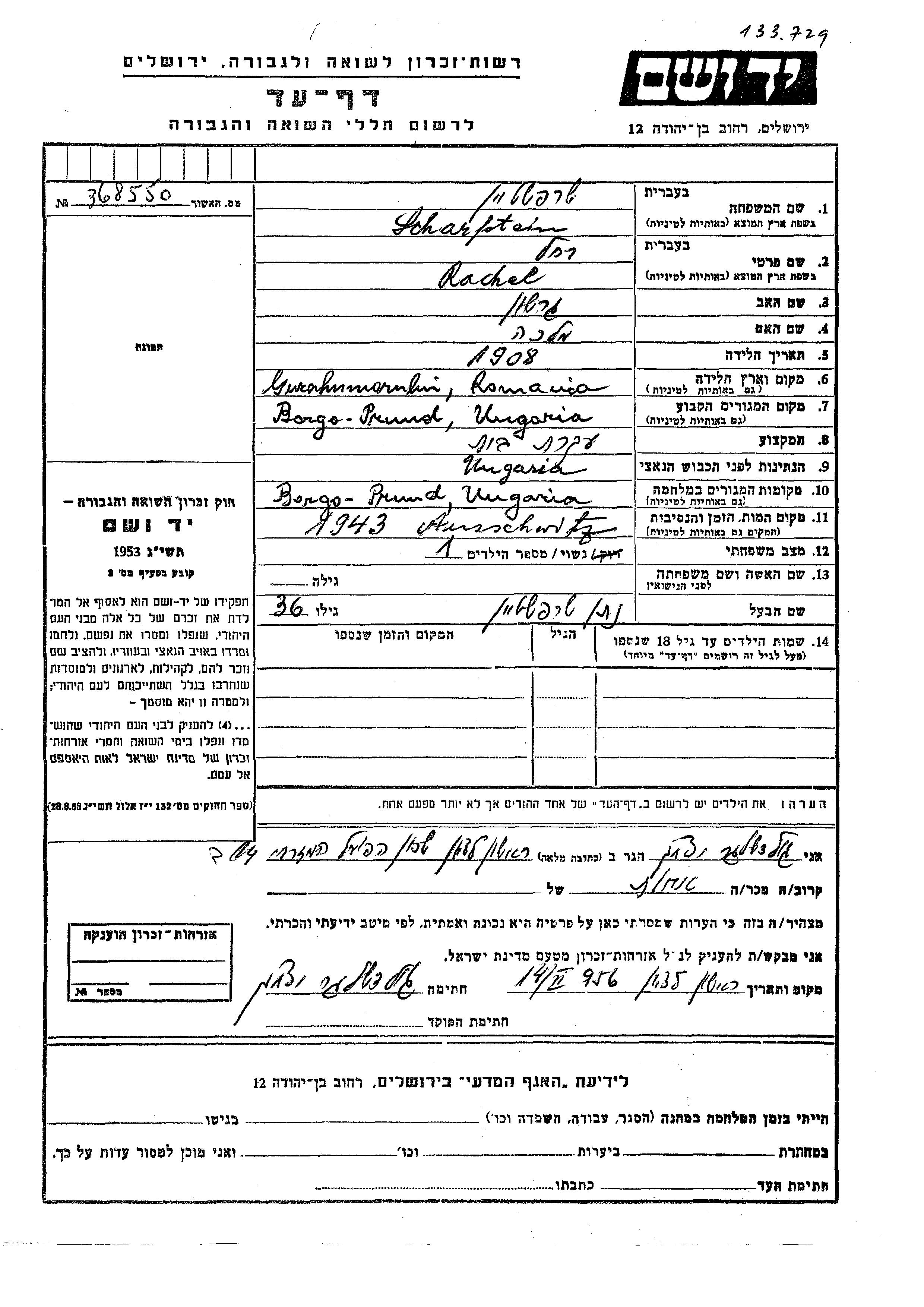 Scharfstein Rachel 1908 Borgoprund, Roumanie Feuille de témoignage