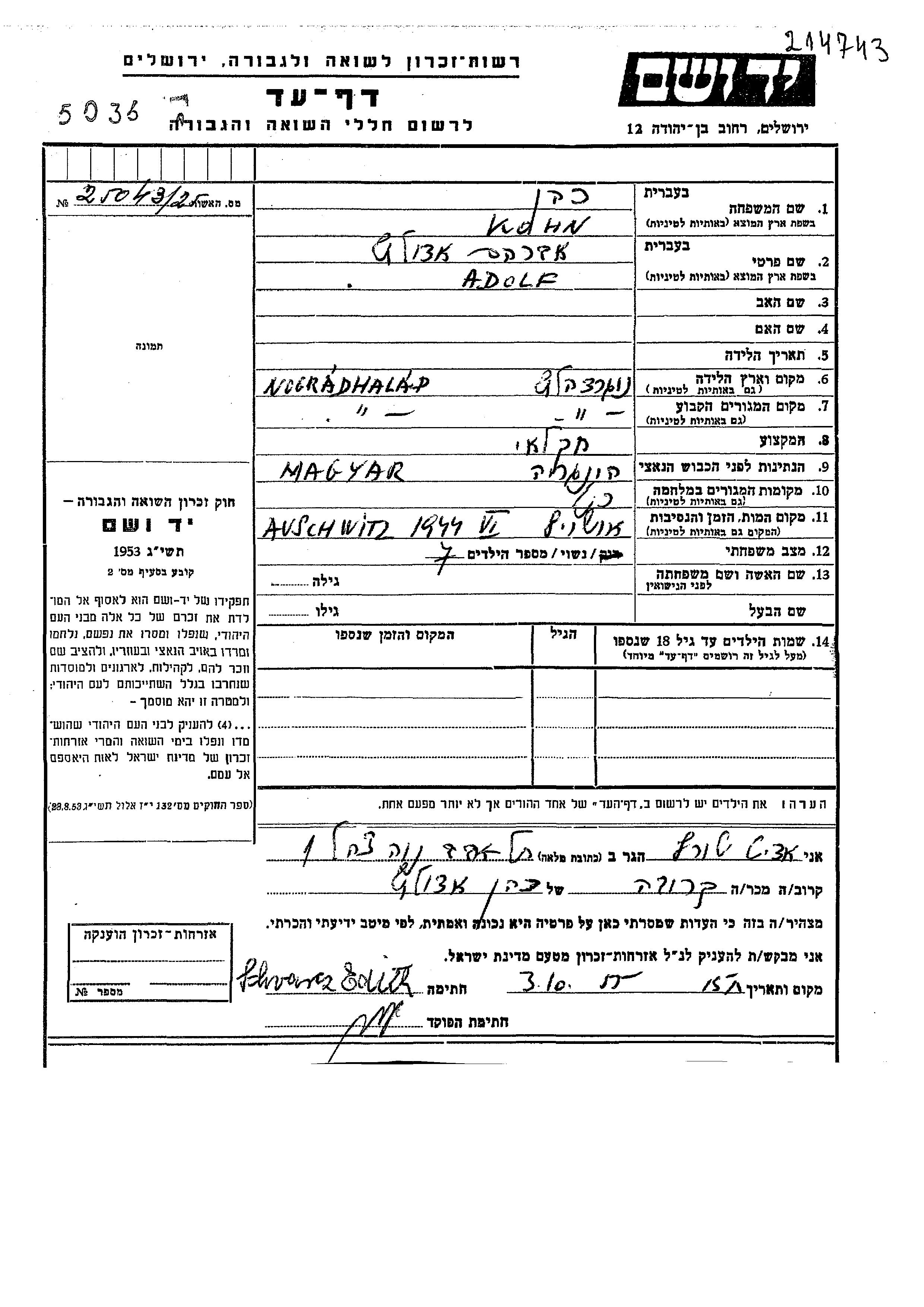 Avraham Adolf a été assassiné pendant la Shoah. Lieu de la mort: Auschwitz, Pologne en 1944.