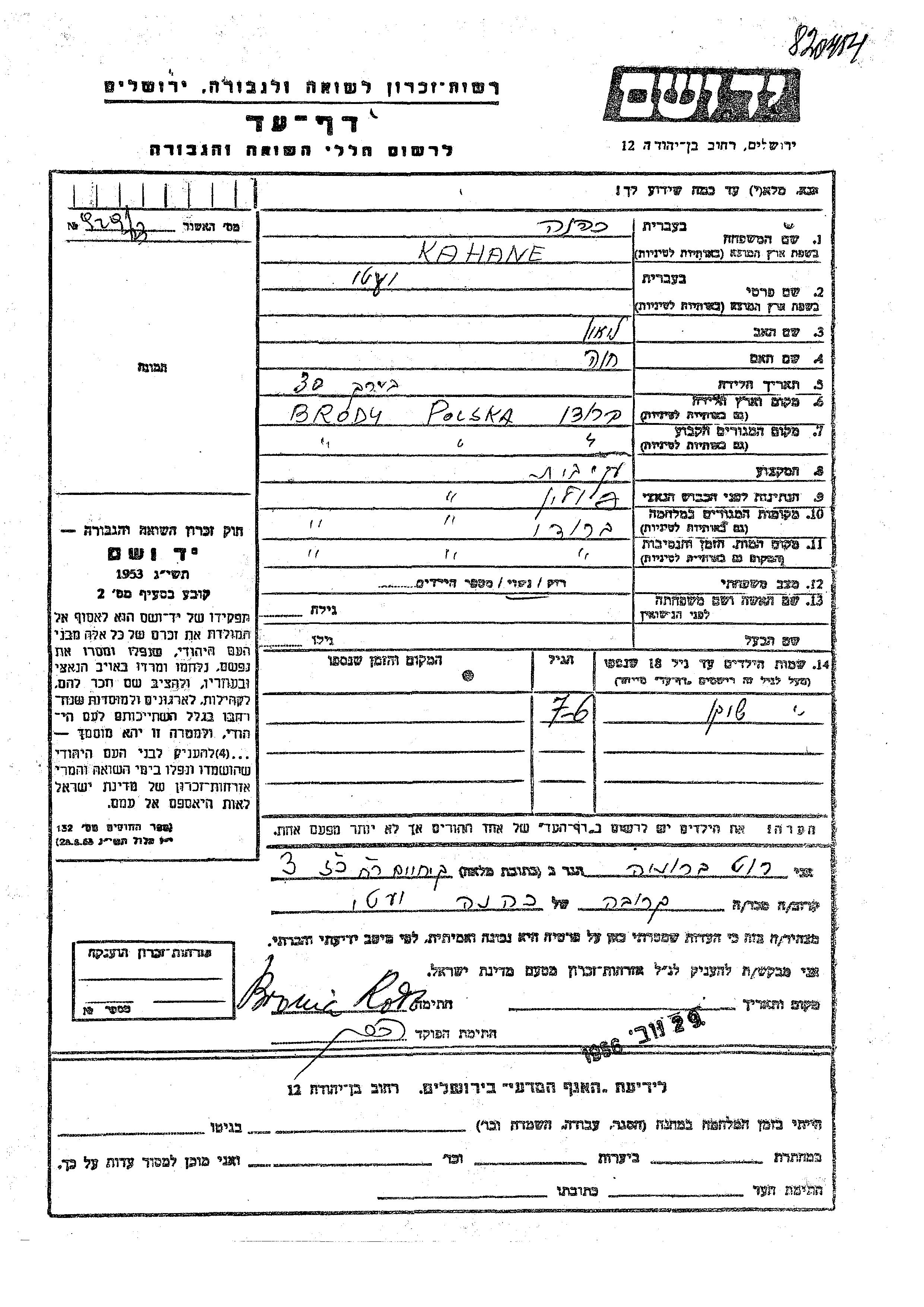 Kahane | Yehudit | Brody, Pologne | Feuille de témoignage | |