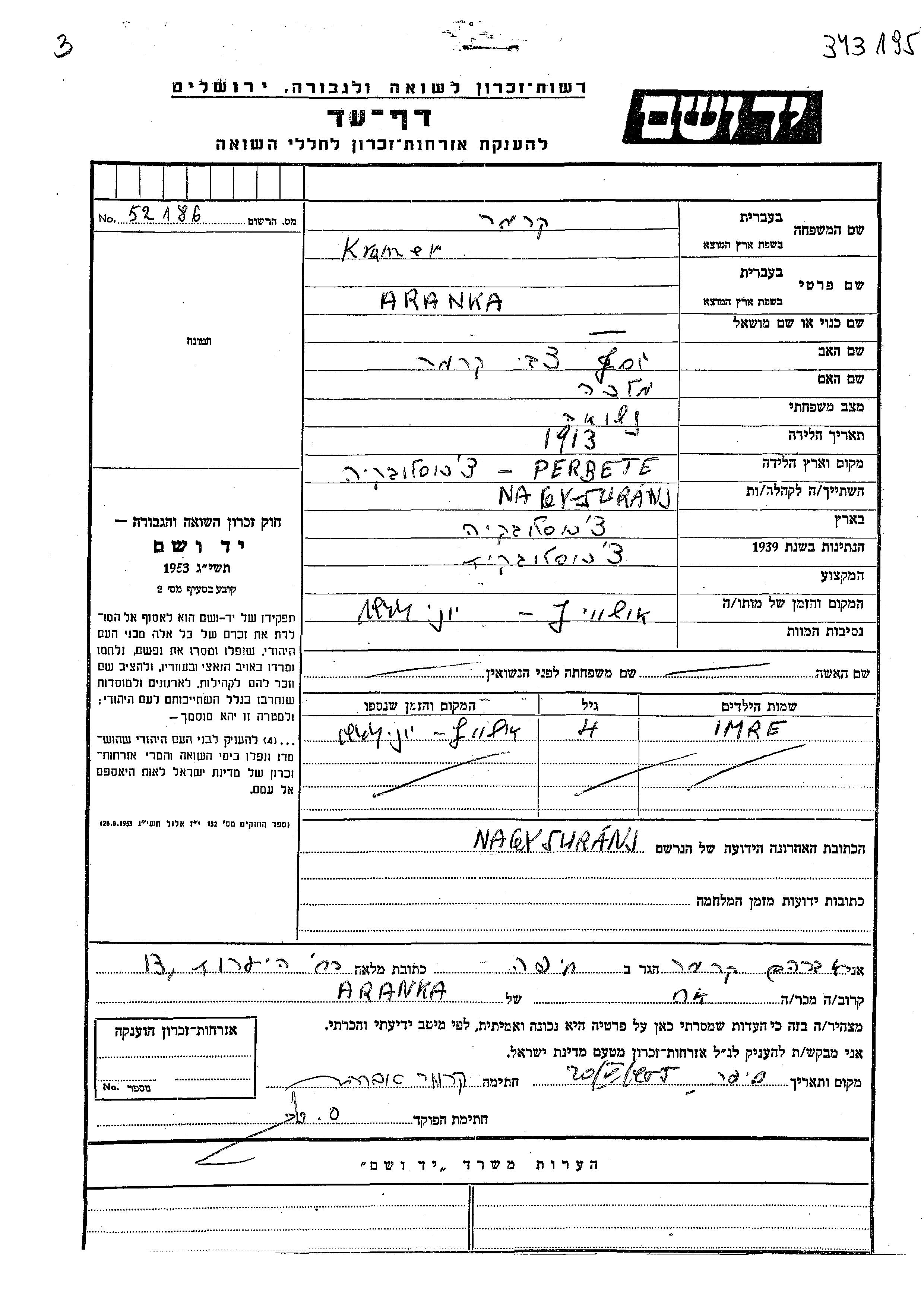 Kramer Aranka 1913 endroit inconnu, Feuille de témoignage