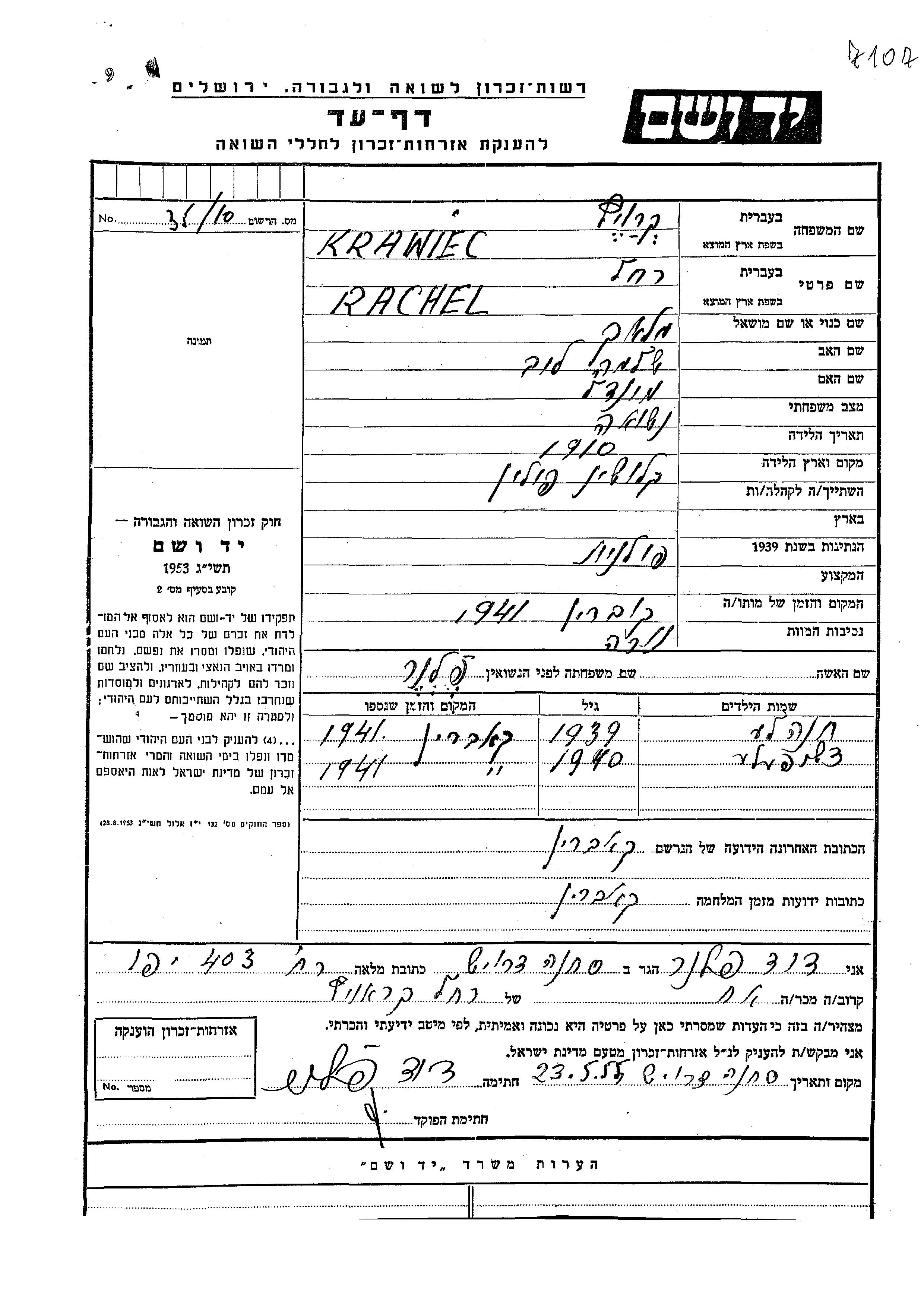 Krawiec Rachel 1910 endroit inconnu, Feuille de témoignage