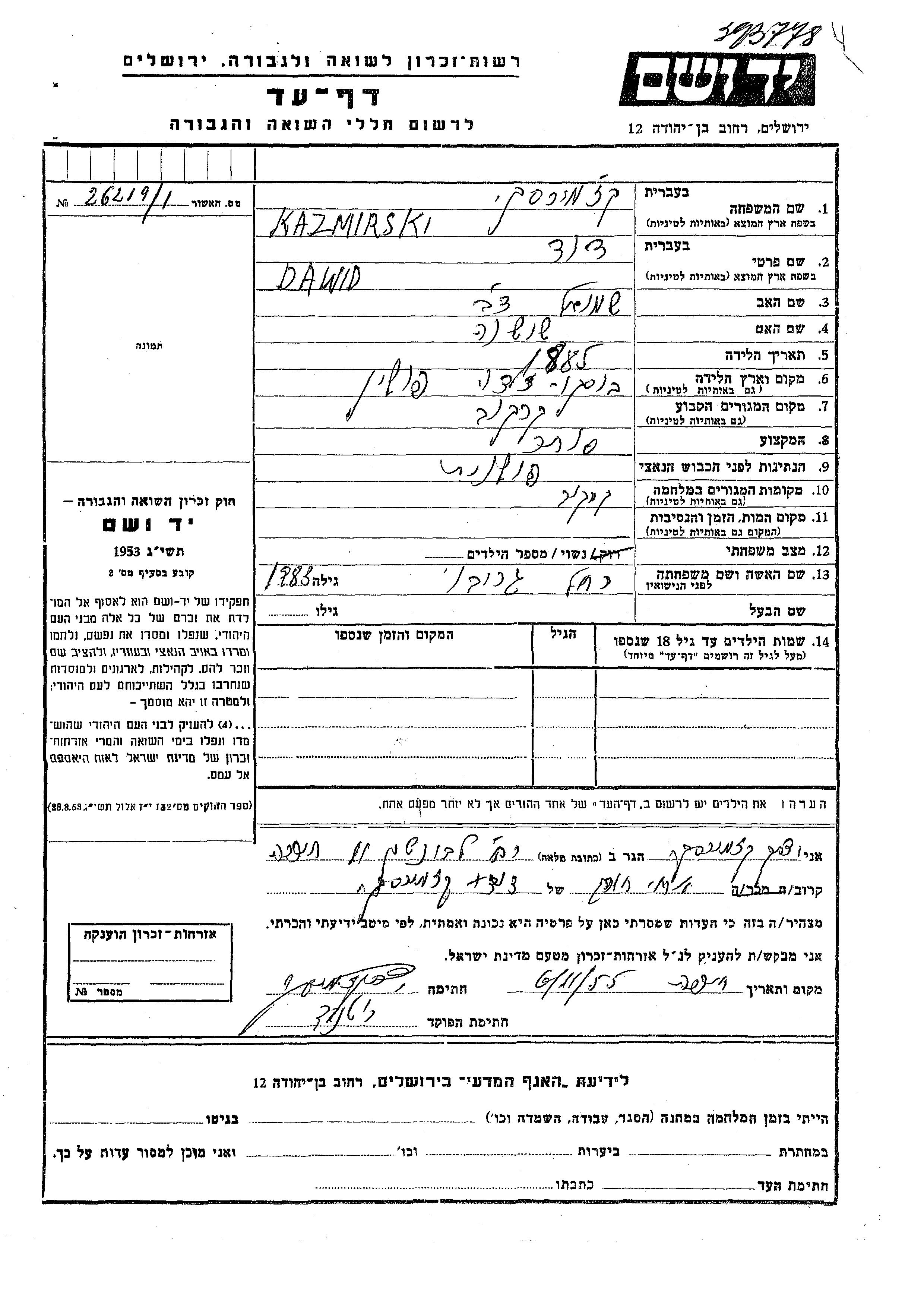 Dawid Kazmirski est né à Busko, Pologne en 1885, fils de Shmuel Dov et de Shoshana. Il était Commerçant/e et Mariée à Rakhel née Grubel. Avant la seconde guerre mondiale il vivait à Krakow, Pologne. Au cours de la guerre, il était à Krakow, Pologne.