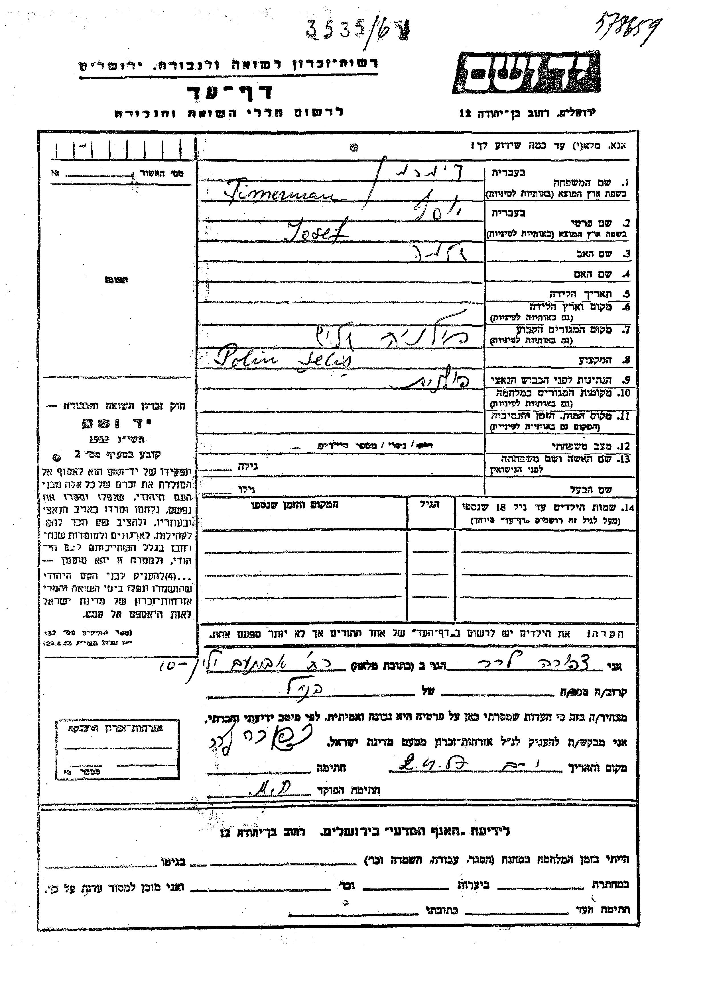 Yosef Tcimerman est né fils de Shlomo. Il était Marié. Avant la seconde guerre mondiale il vivait à Kalisz, Pologne.