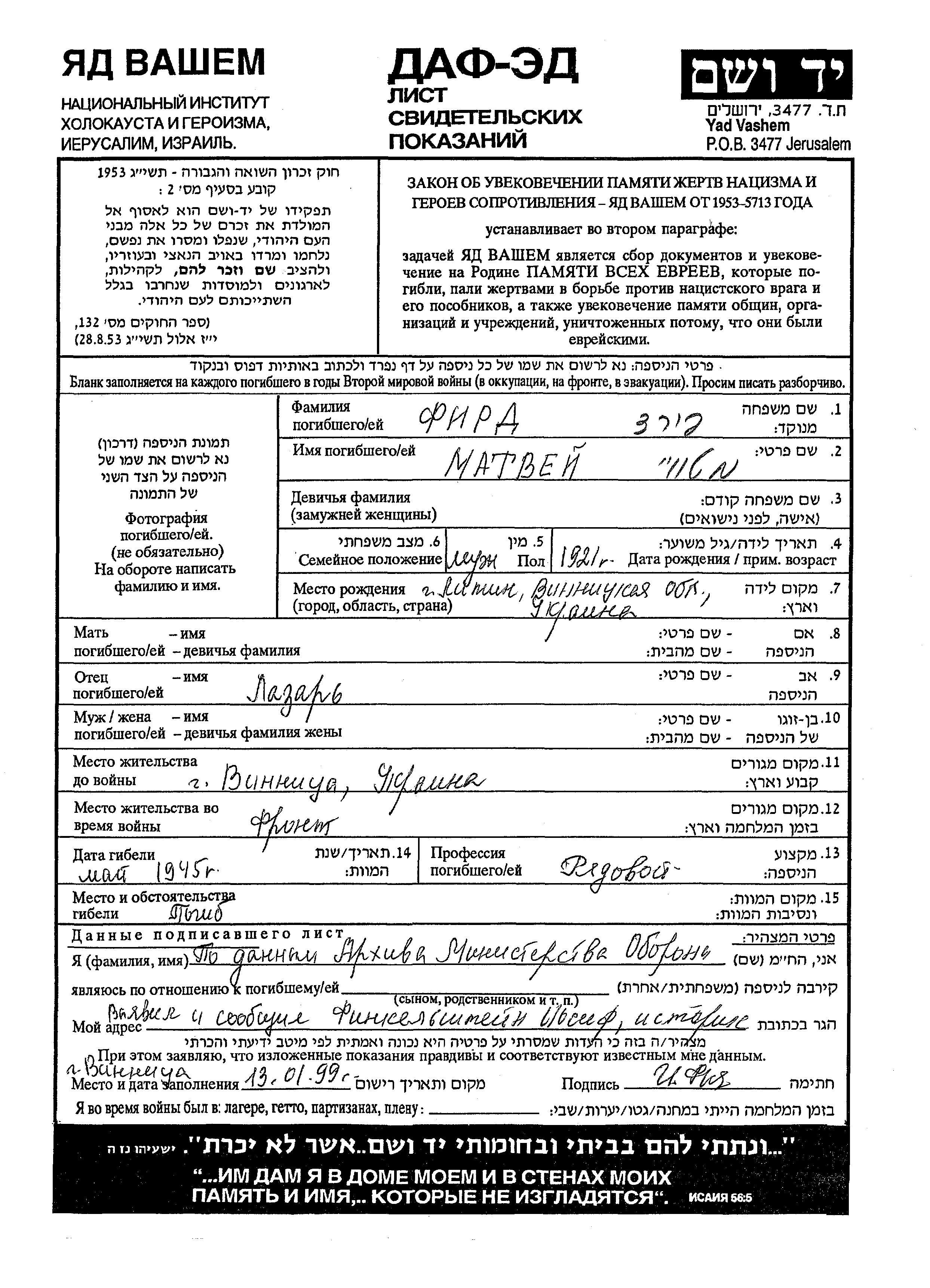 Fird | Matvei | 1921 | Vinnitza, Ukraine (URSS) | Feuille de témoignage |