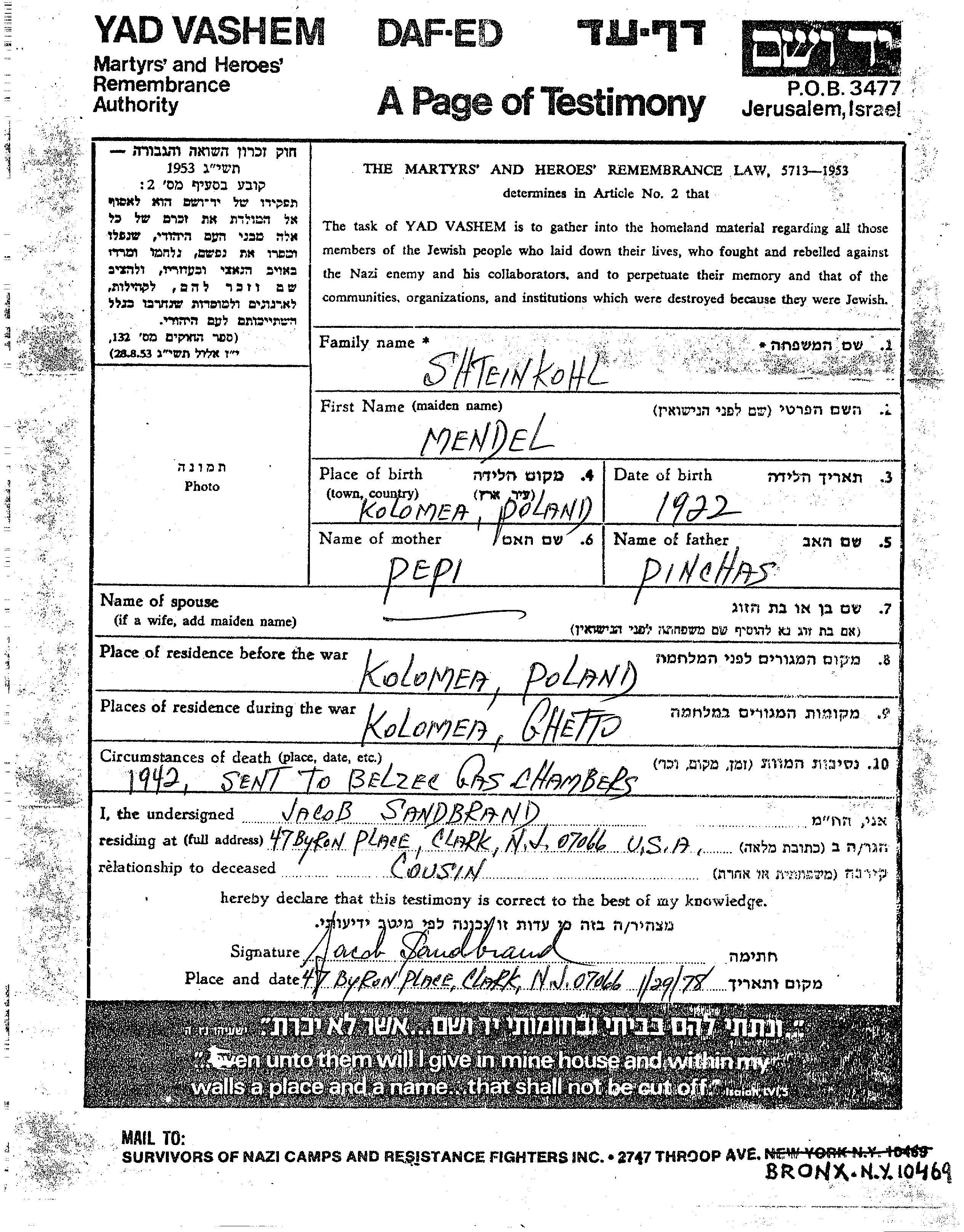 Shteinkohl Mendel 1922 Kolomea, Pologne Feuille de témoignage