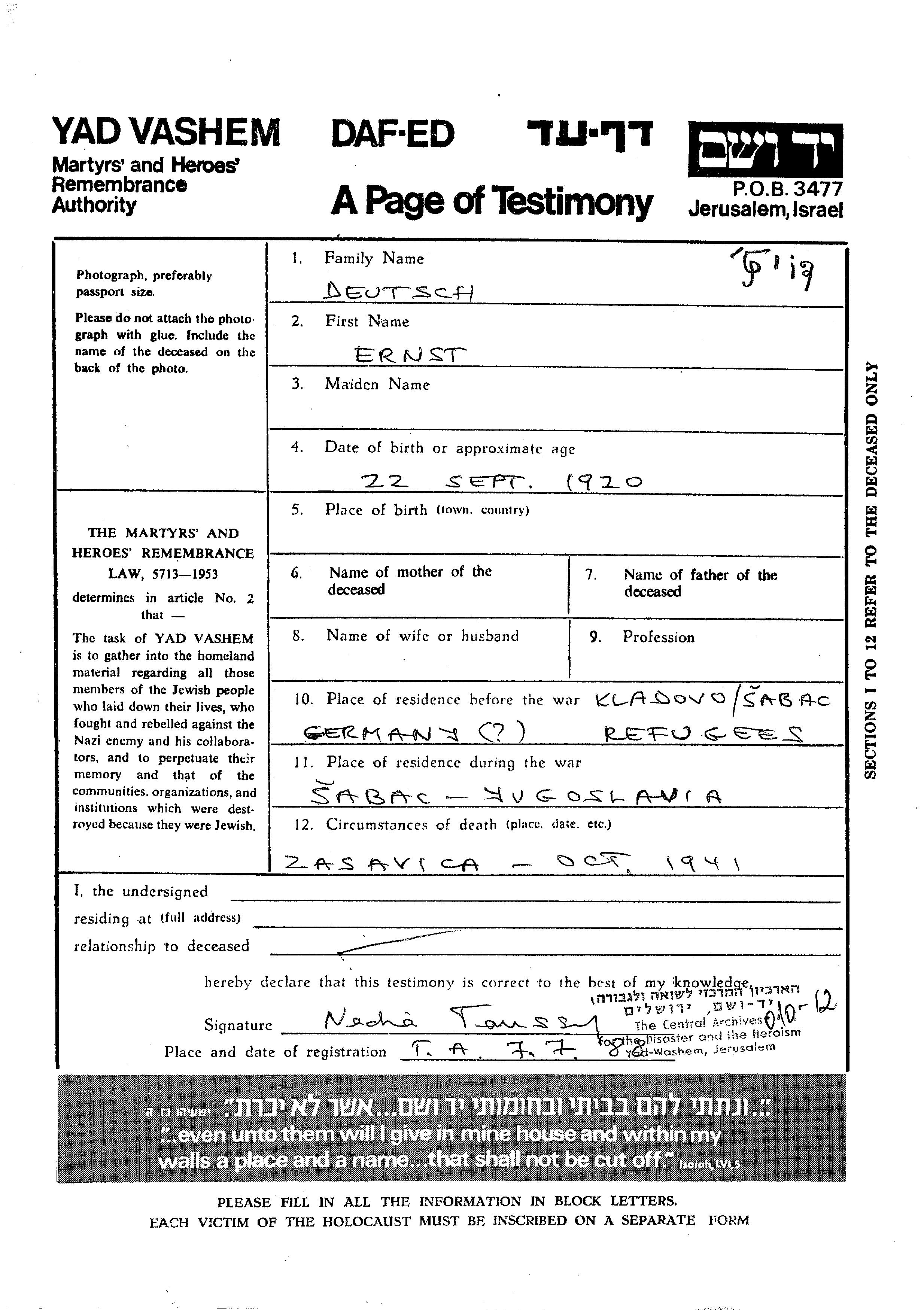 Ernst Deutsch est né en 1920. Avant la seconde guerre mondiale il vivait à Kladovo, Yugoslavie. Au cours de la guerre, il était à Sabac, Yugoslavie.