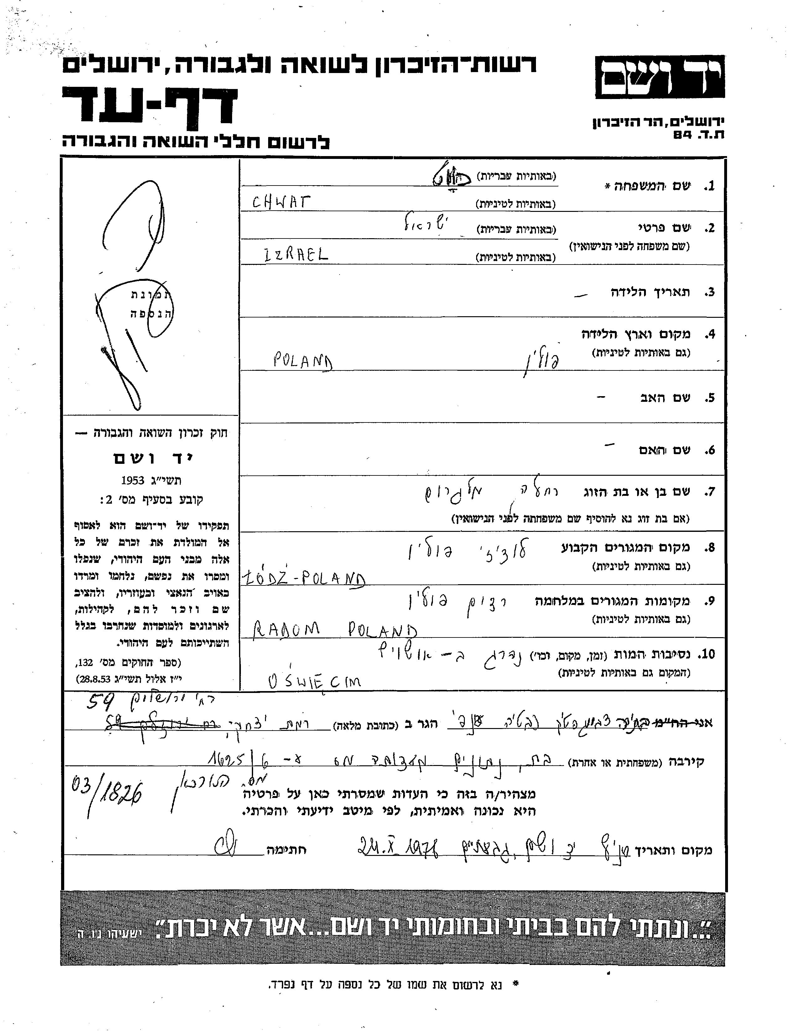 Chwat Izrael Lodz, Pologne Feuille de témoignage