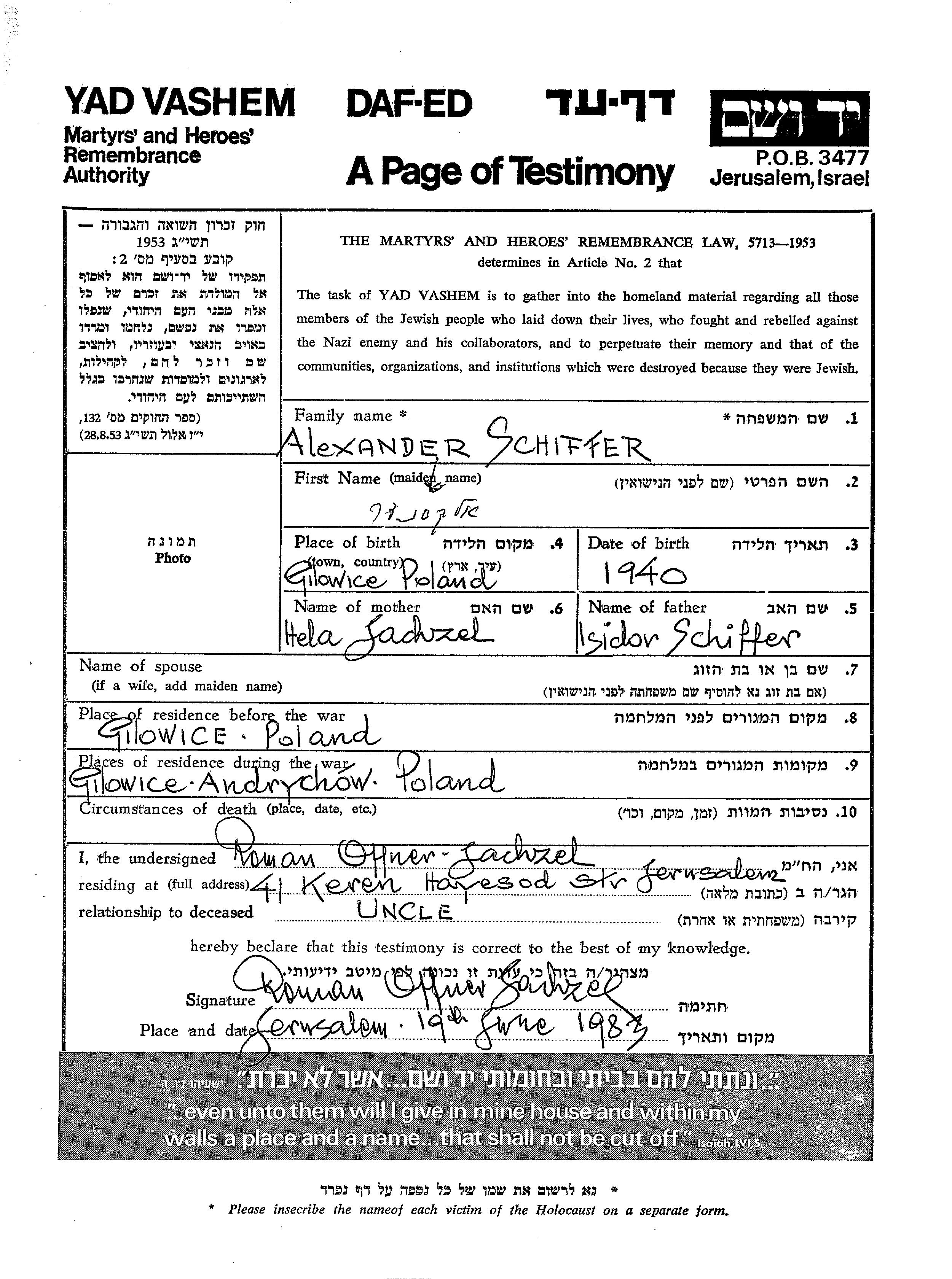 Schiffer Alexander 1940 Gilowice, Pologne Feuille de témoignage