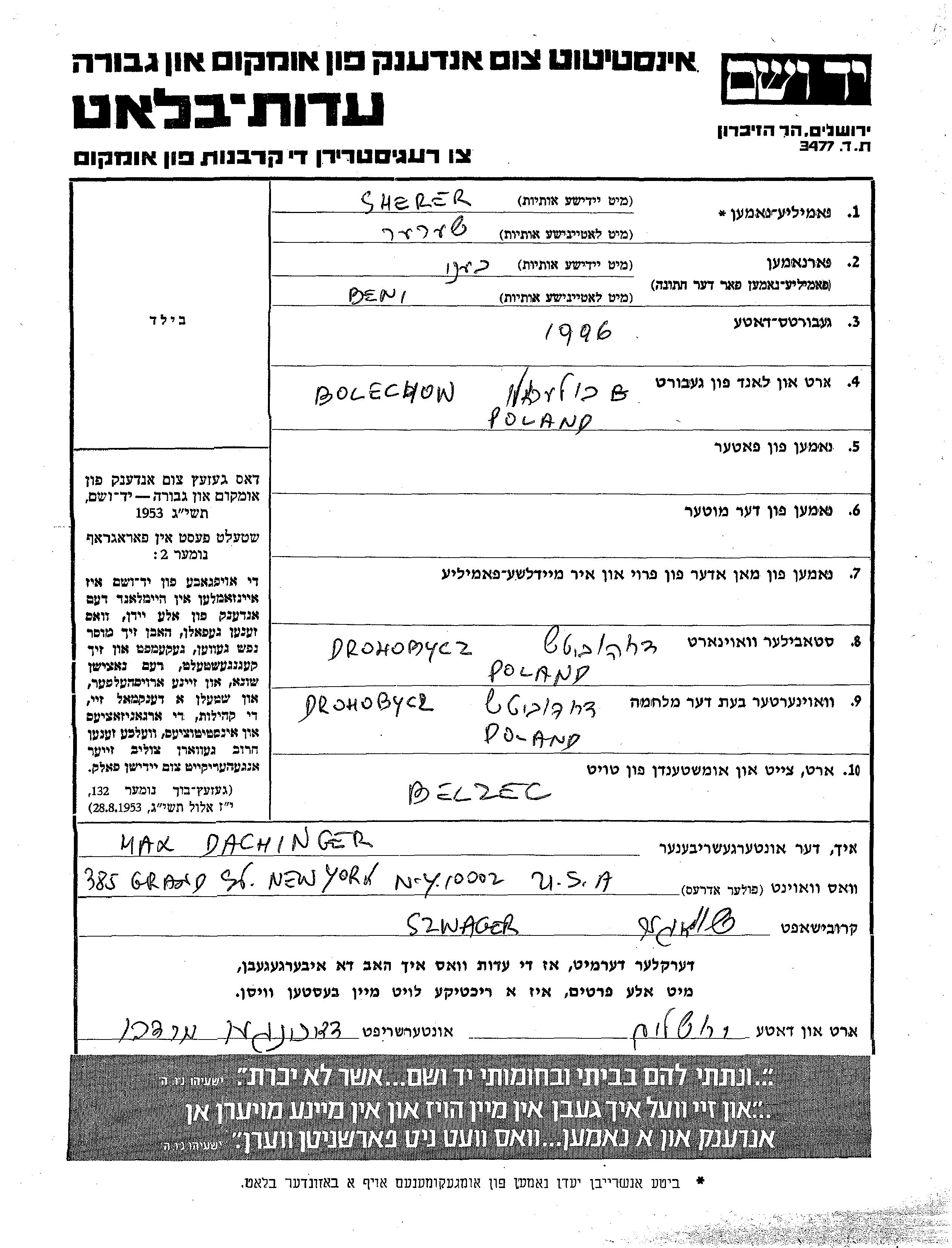 Sherer Beni 1906 Drohobycz, Pologne Feuille de témoignage