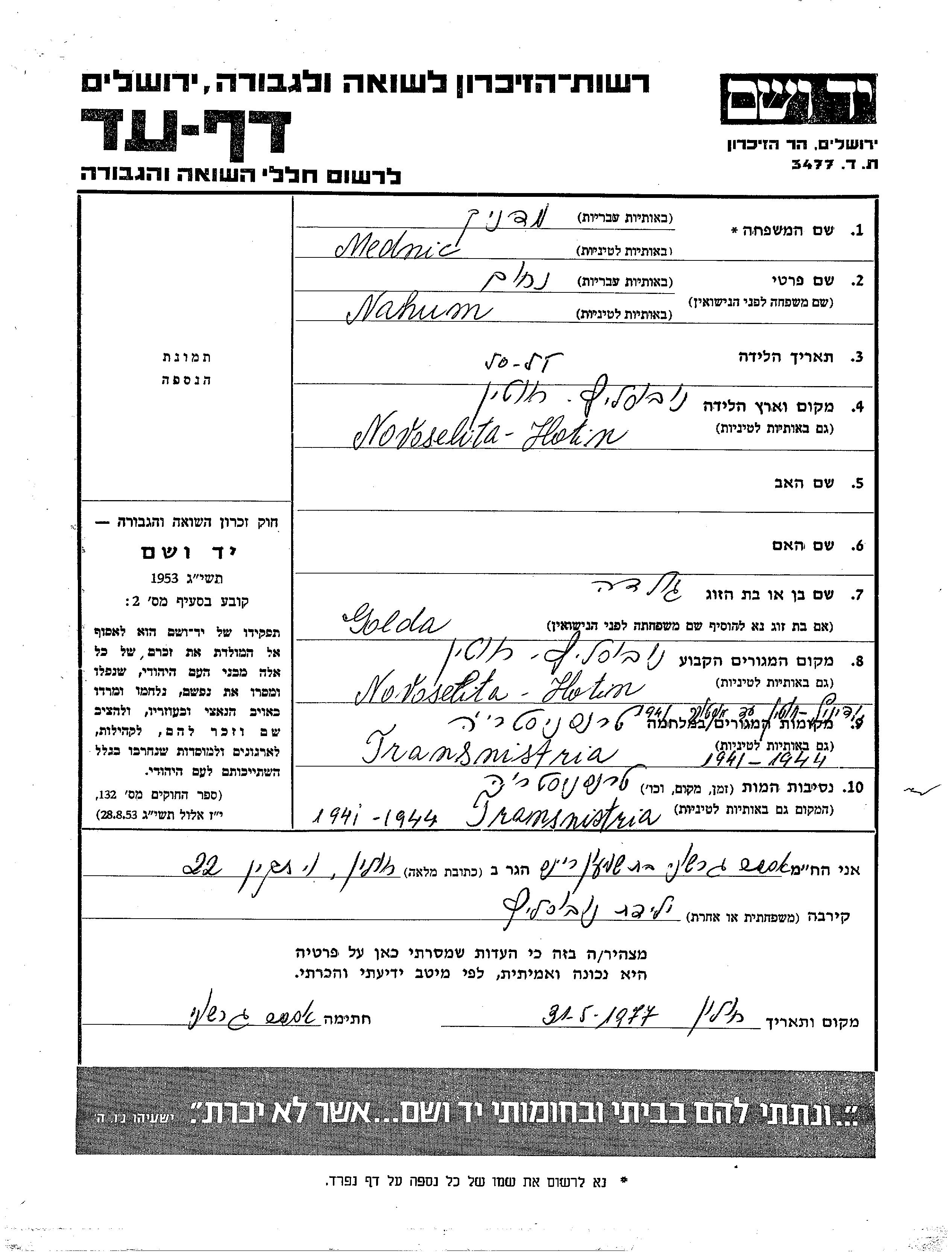 Mednic Nahum Novoselita, Roumanie Feuille de témoignage