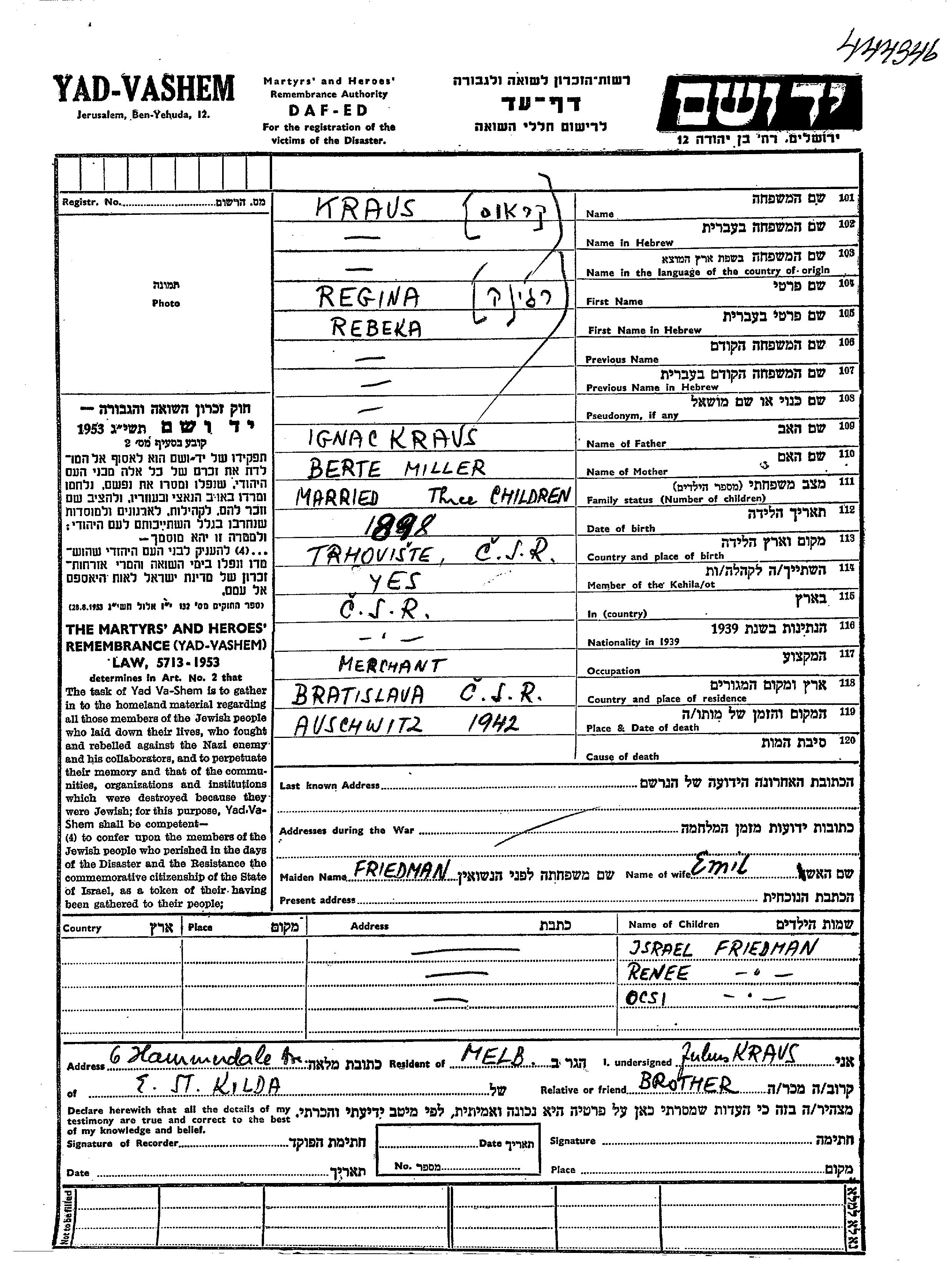 Fridman Rene Presburg, Tchécoslovaquie Feuille de témoignage