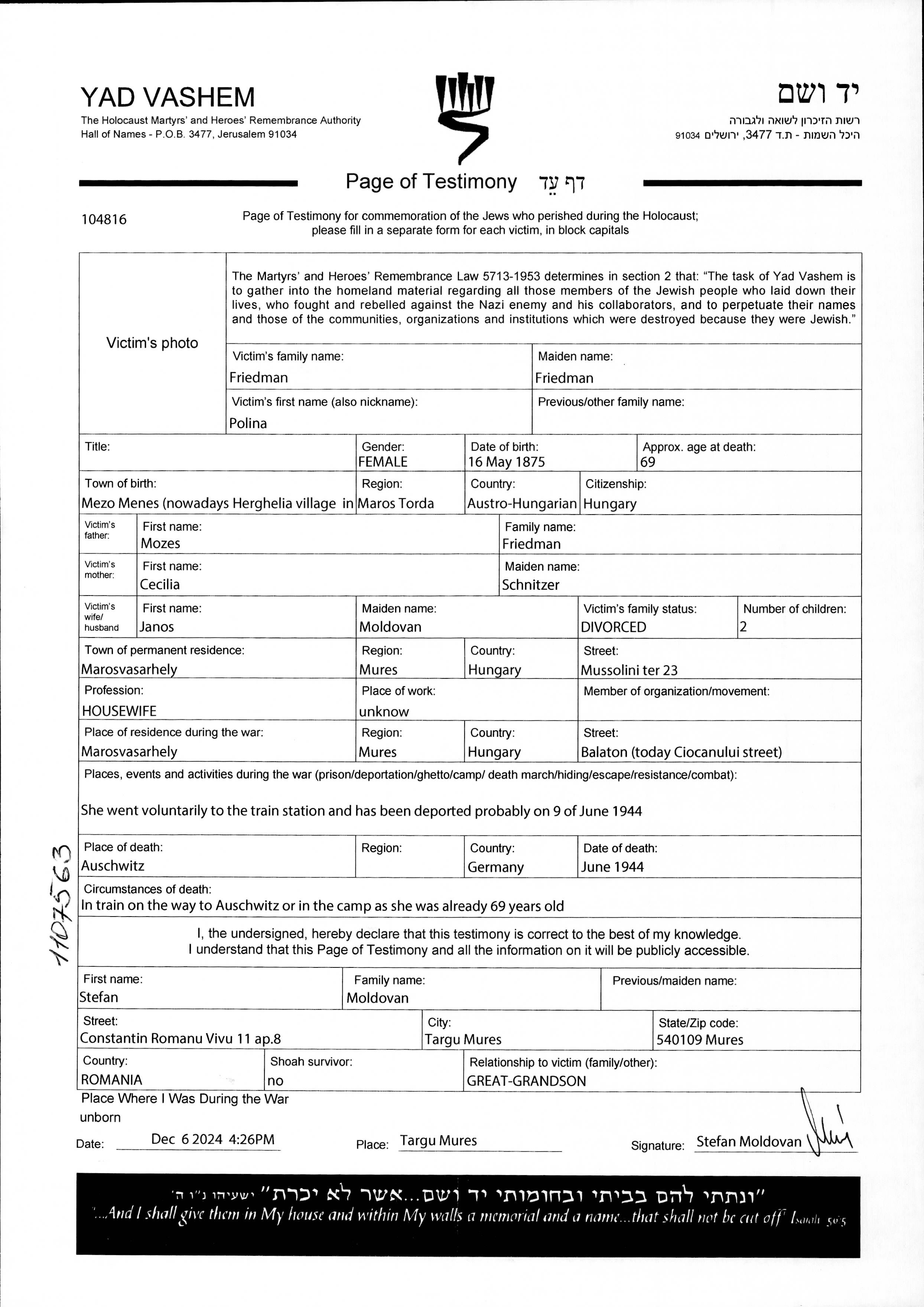 Polina Moldovan née Friedman est née à Mezomenes, Roumanie en 1875. Elle était Femme au foyer. Avant la seconde guerre mondiale elle vivait à Marosvasarhely, Roumanie.