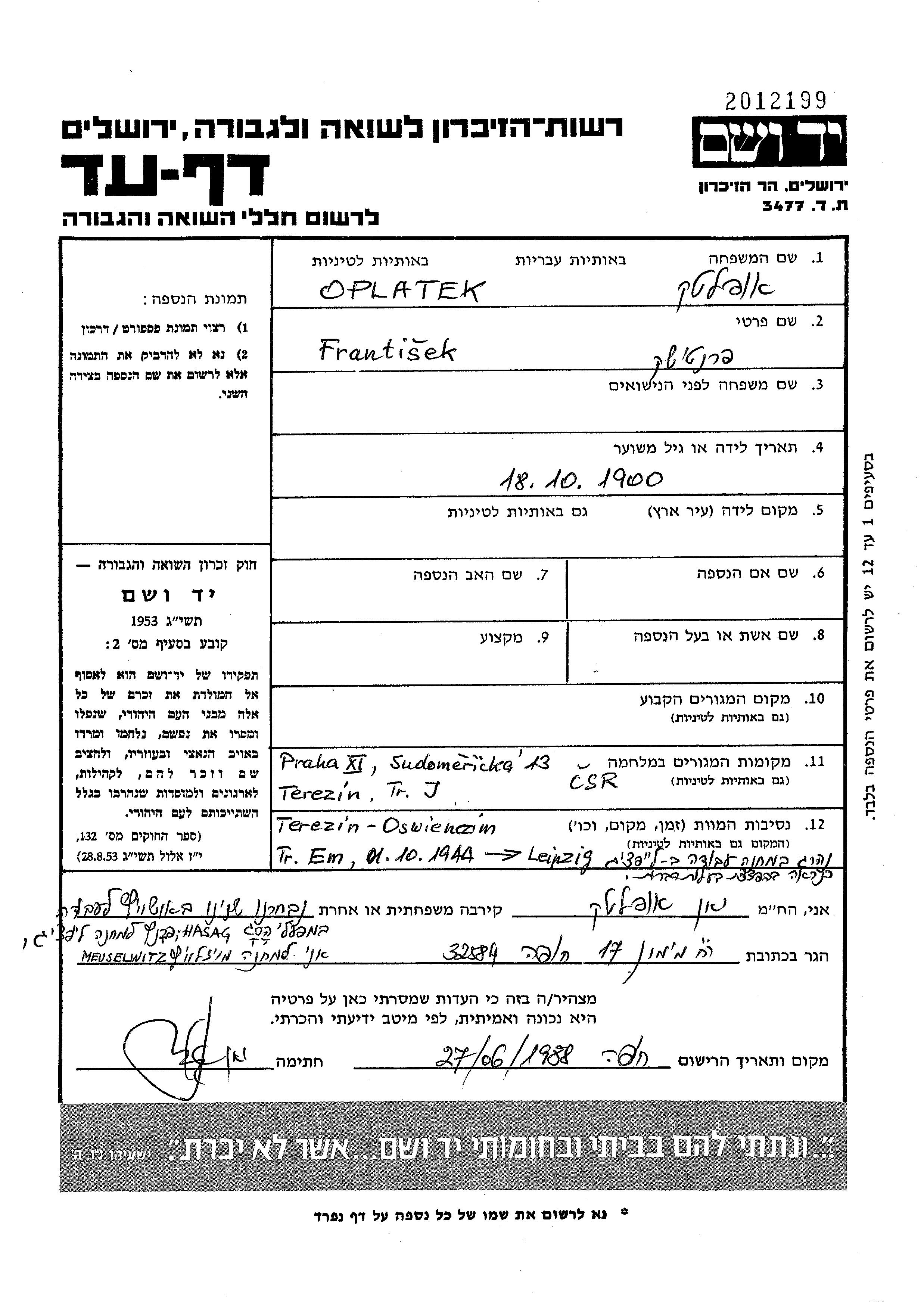 Oplatek Frantisek 1900 endroit inconnu, Feuille de témoignage