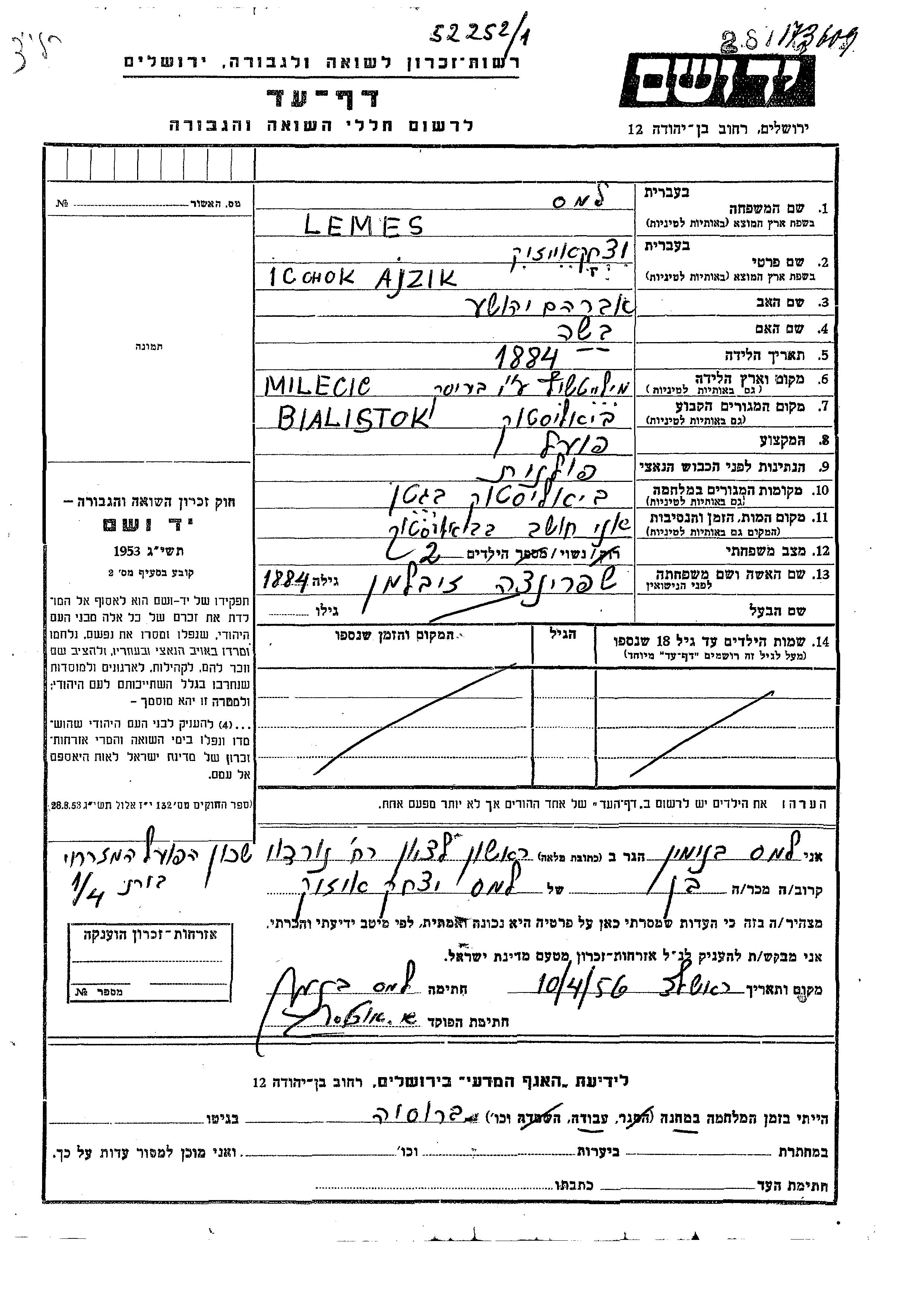Lemes Icchok 1884 Bialistok, Pologne Feuille de témoignage