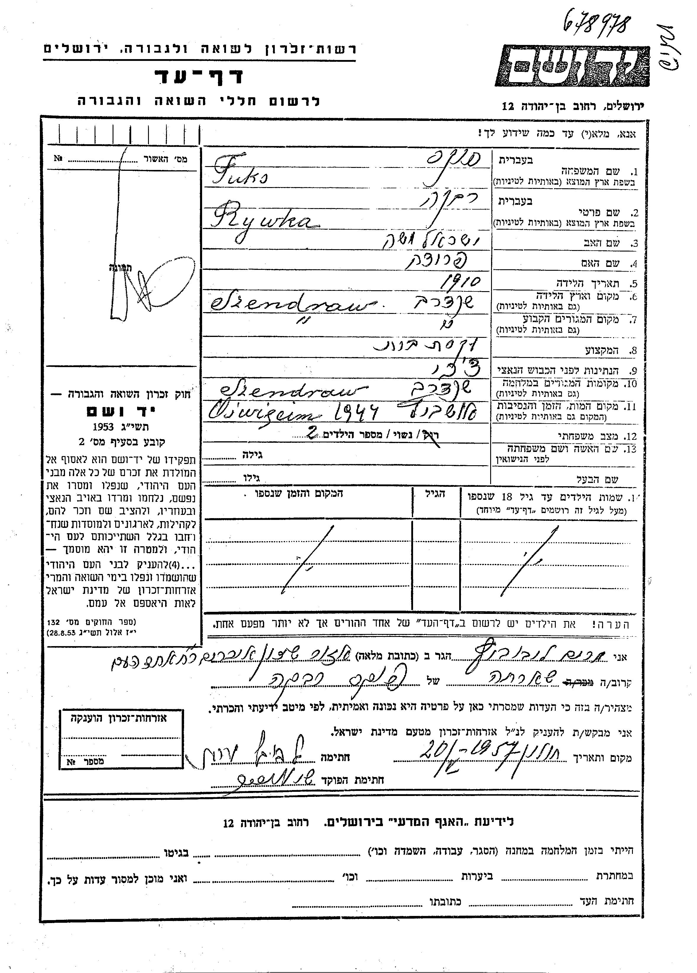 Fuks Rivka 1910 Szendrew, Tchécoslovaquie Feuille de témoignage