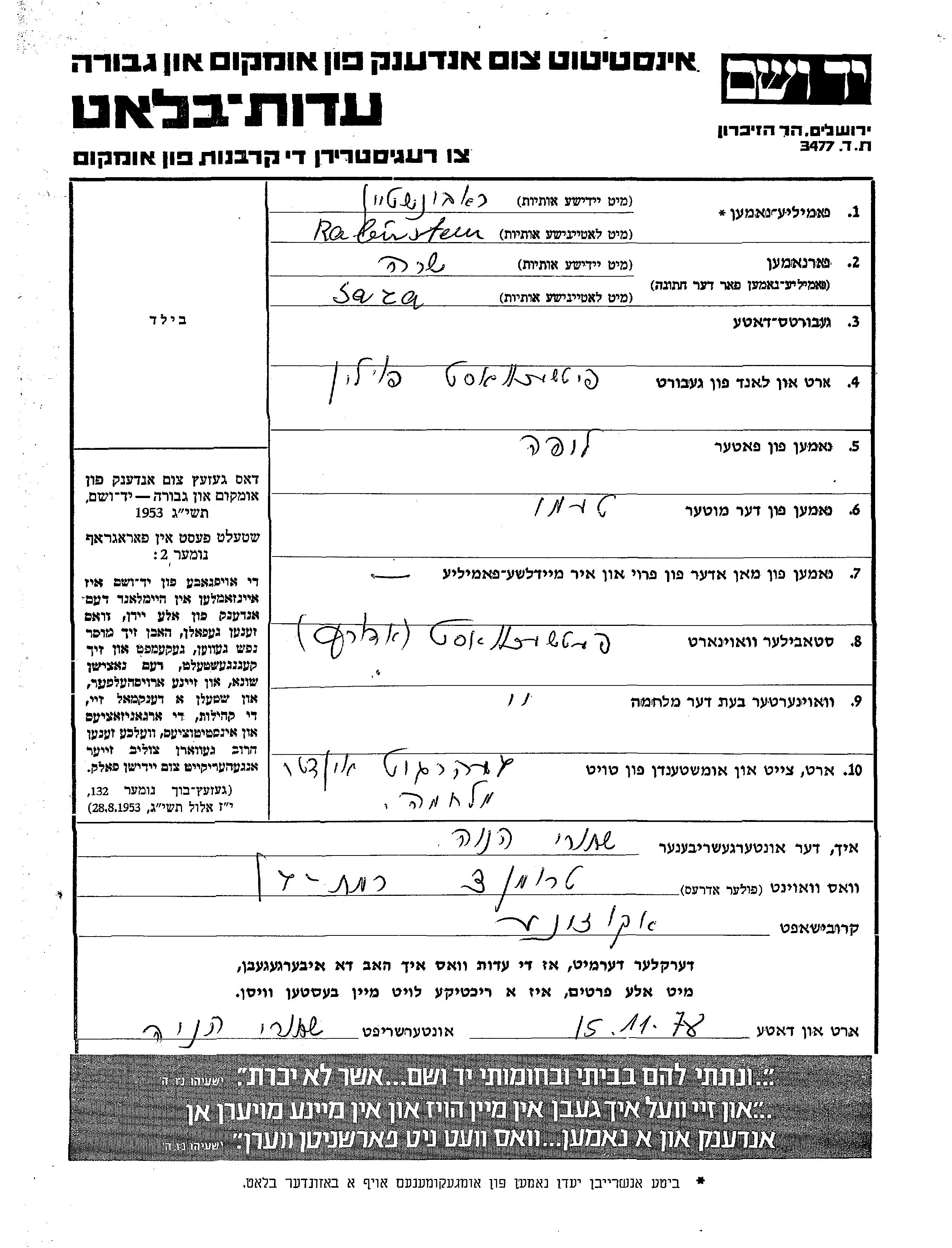 Rabinstein Rubinshtein Sara Pieczychwosty, Pologne Feuille de témoignage