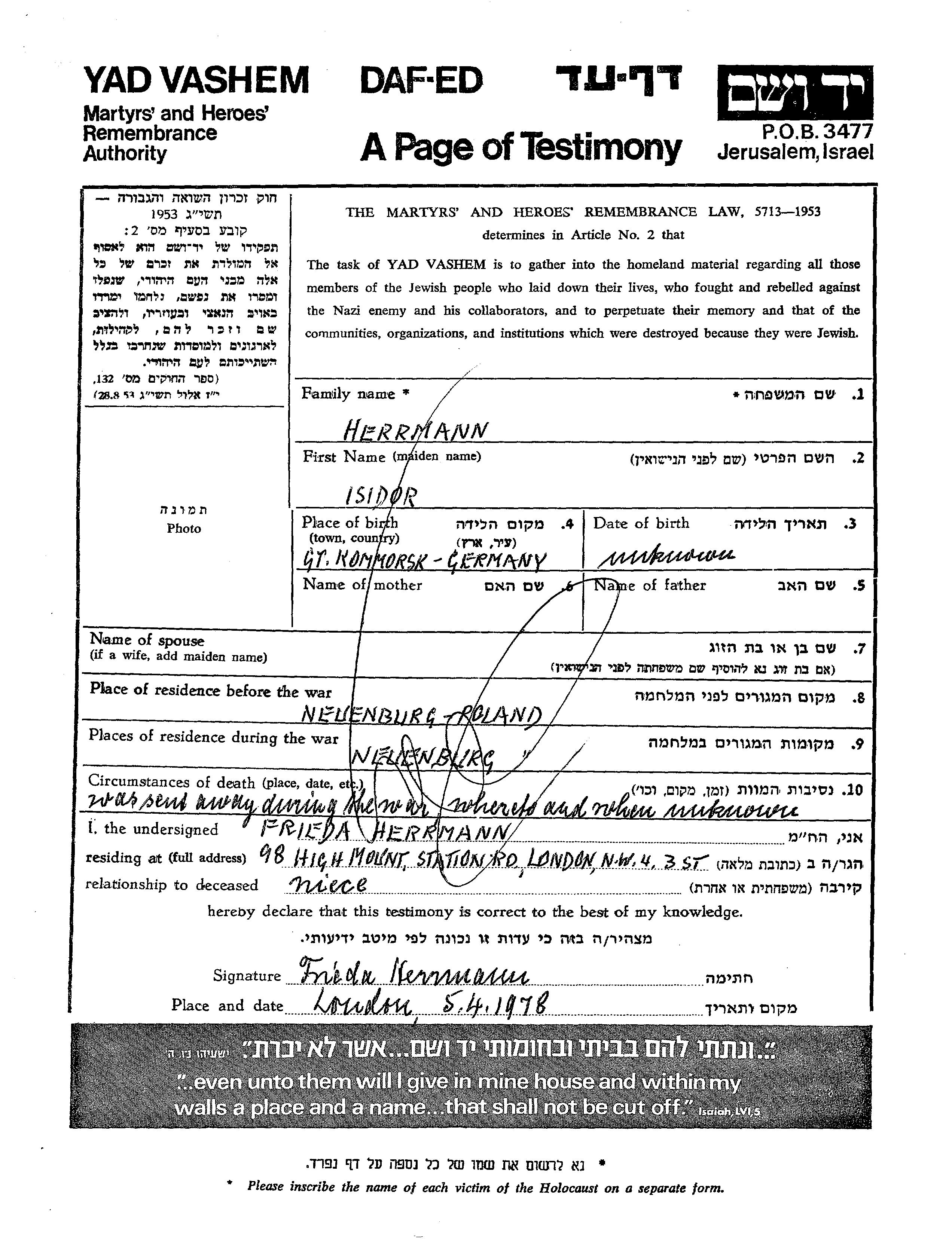 Isidor Herrmann est né à Gross Kommorsk, Pologne. Avant la seconde guerre mondiale il vivait à Neuenburg, Pologne. Au cours de la guerre, il était à Neuenburg, Pologne.