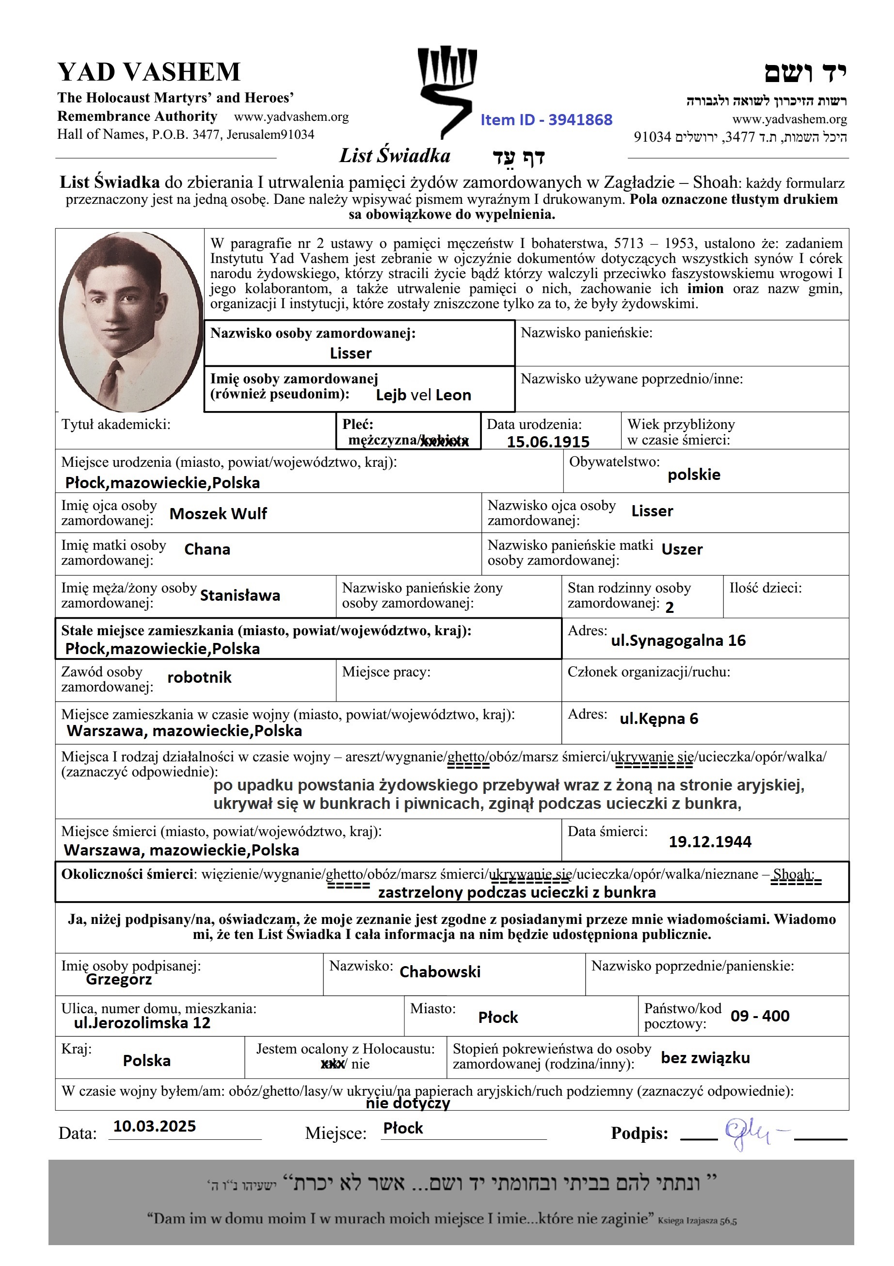 Lisser Lejb Leon 1915 Plock, Pologne Feuille de témoignage