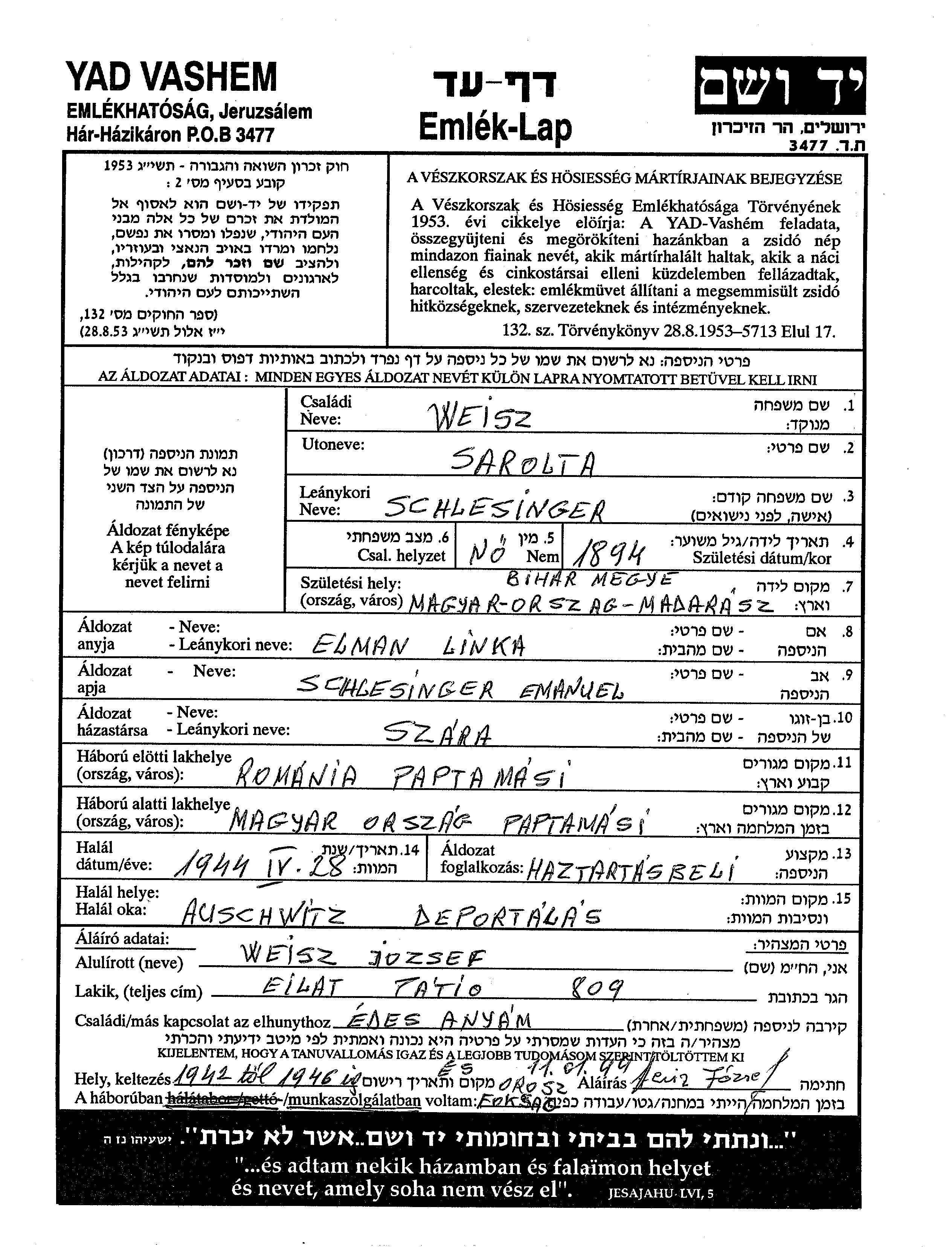 Weisz Sarlota 1894 Paptamasi, Roumanie Feuille de témoignage
