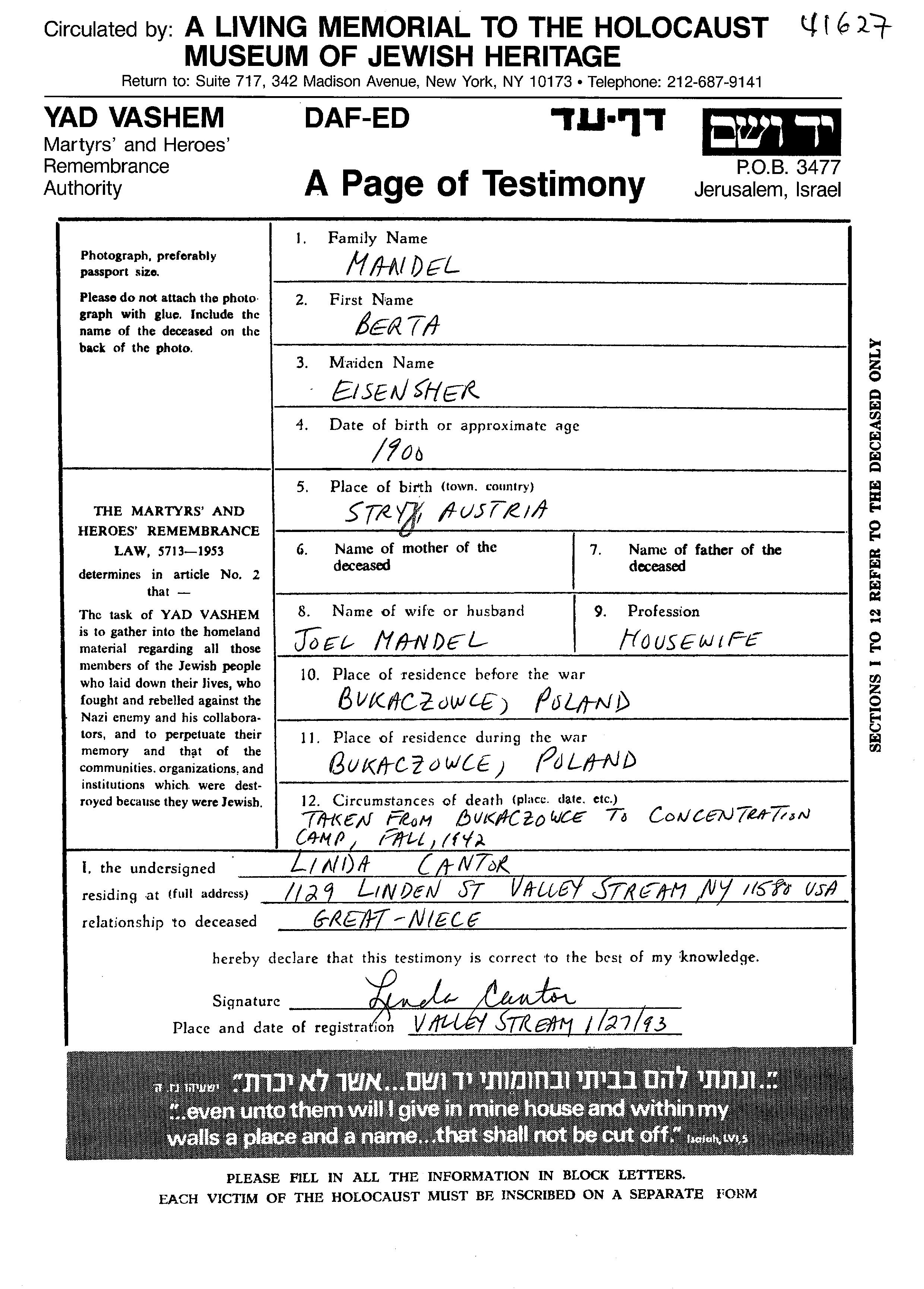 Mandel Berta 1910 Bukaczowce, Pologne Feuille de témoignage