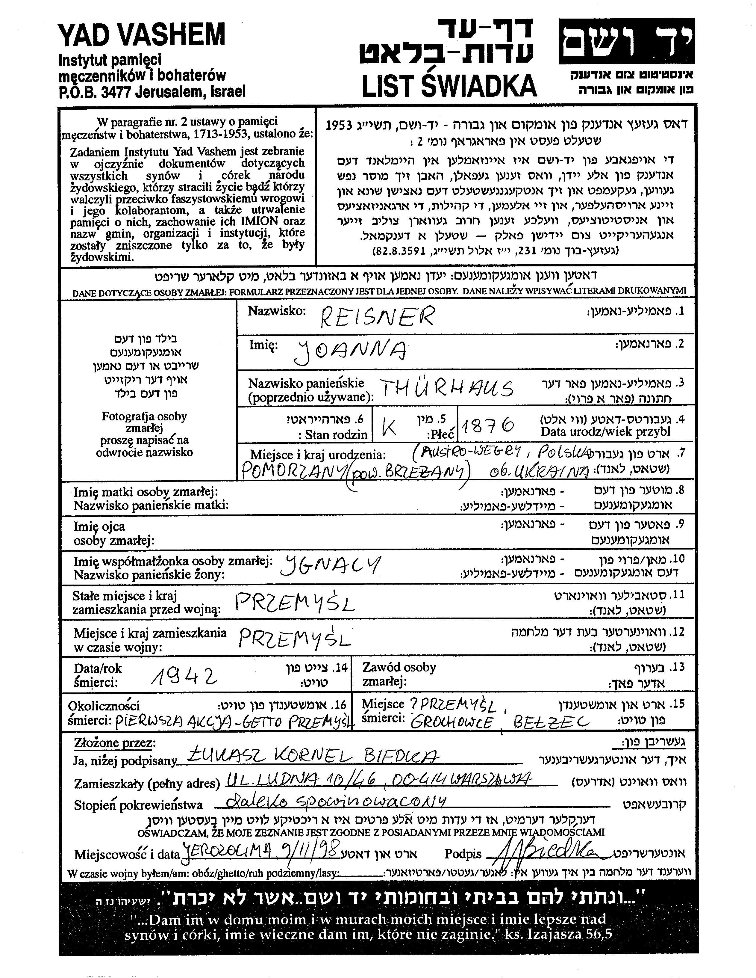 Reisner Joanna 1876 Przemysl, Pologne Feuille de témoignage