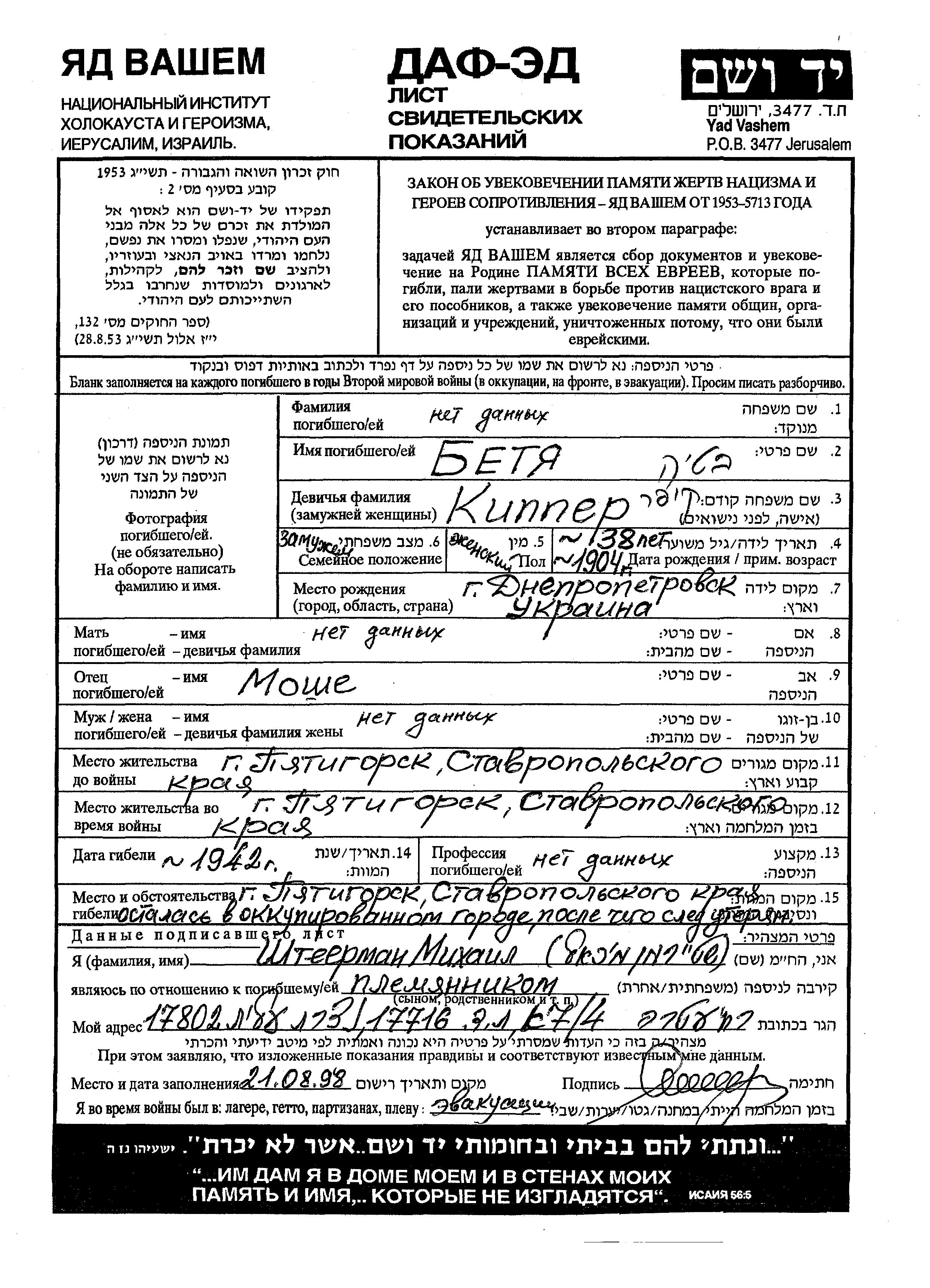 Betya nom inconnu née Kipper est née à Dnepropetrovsk, Ukraine (URSS) en 1904, fille de Moshe. Elle était Mariée. Avant la seconde guerre mondiale elle vivait à Pyatigorsk, Russie (URSS). Pendant la guerre, elle était à Pyatigorsk, Russie (URSS).