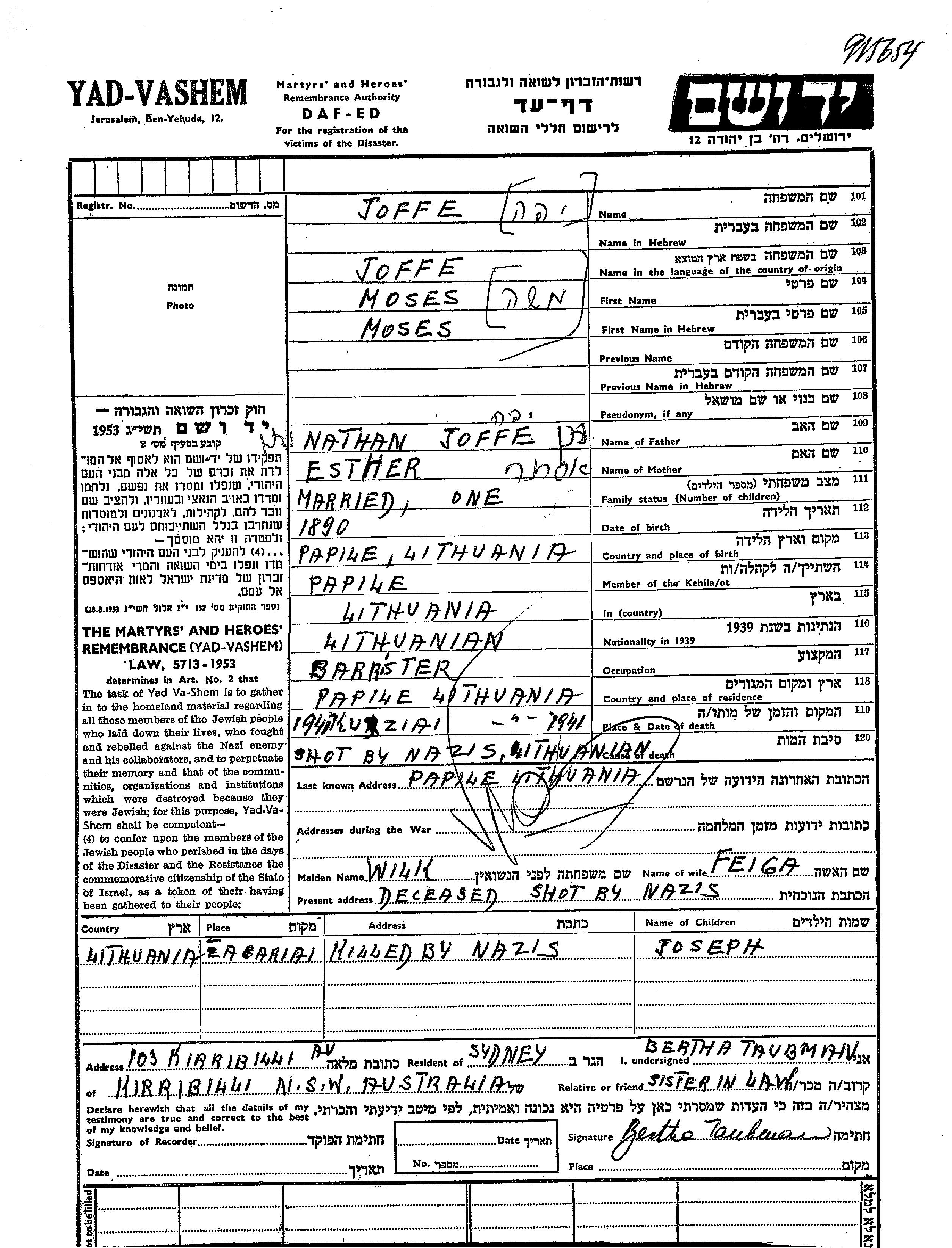 Moses Joffe est né à Papilė, Lituanie en 1890, fils de Nathan et de Esther. Il était Barrister et Mariée à Feiga née Wilk. Avant la seconde guerre mondiale il vivait à Papilė, Lituanie. Au cours de la guerre, il était à Papilė, Lituanie.