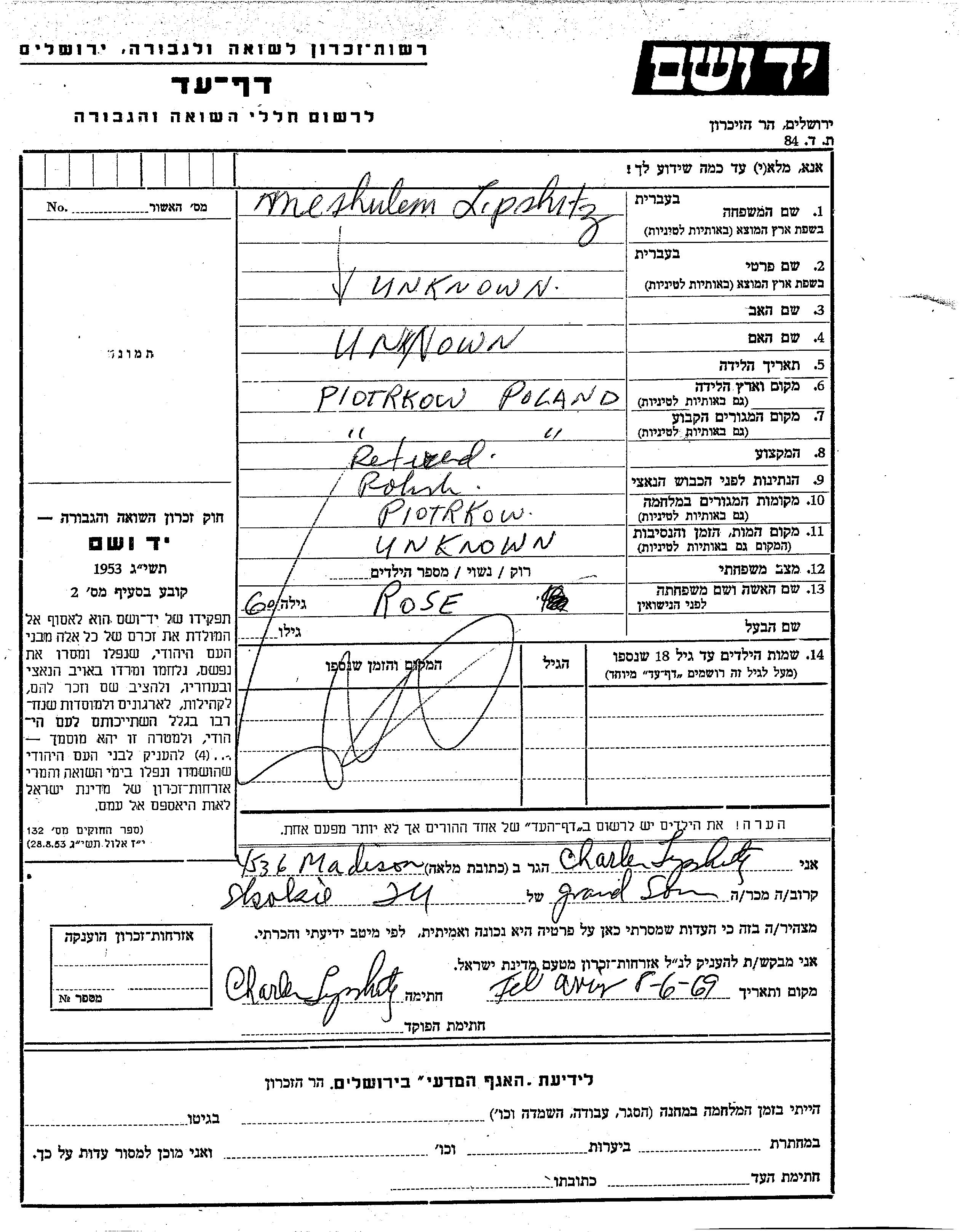 Lipshitz Meshulem Piotrkow, Pologne Feuille de témoignage
