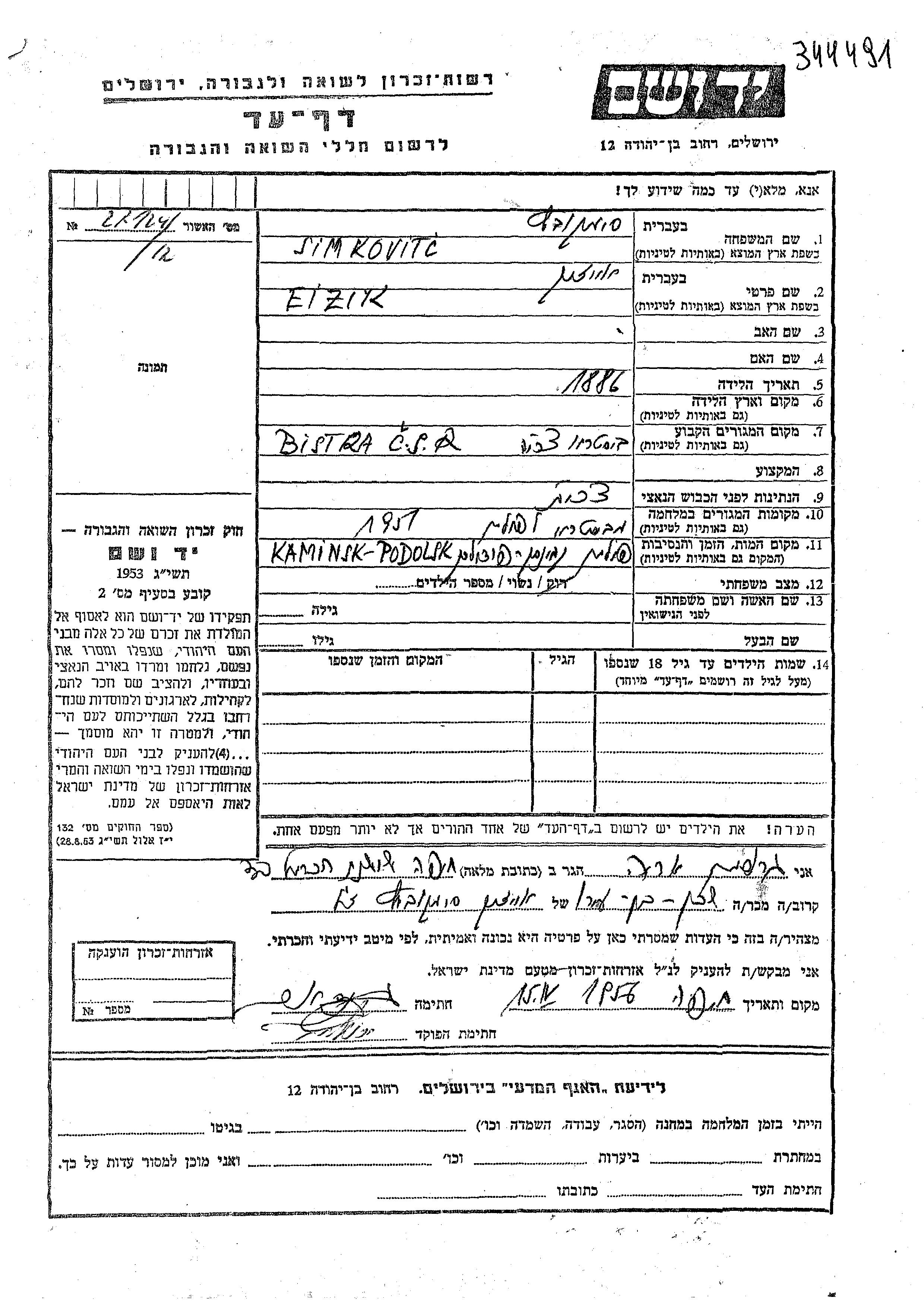 Simkovitc Eizik 1886 Bisztra, Tchécoslovaquie Feuille de témoignage