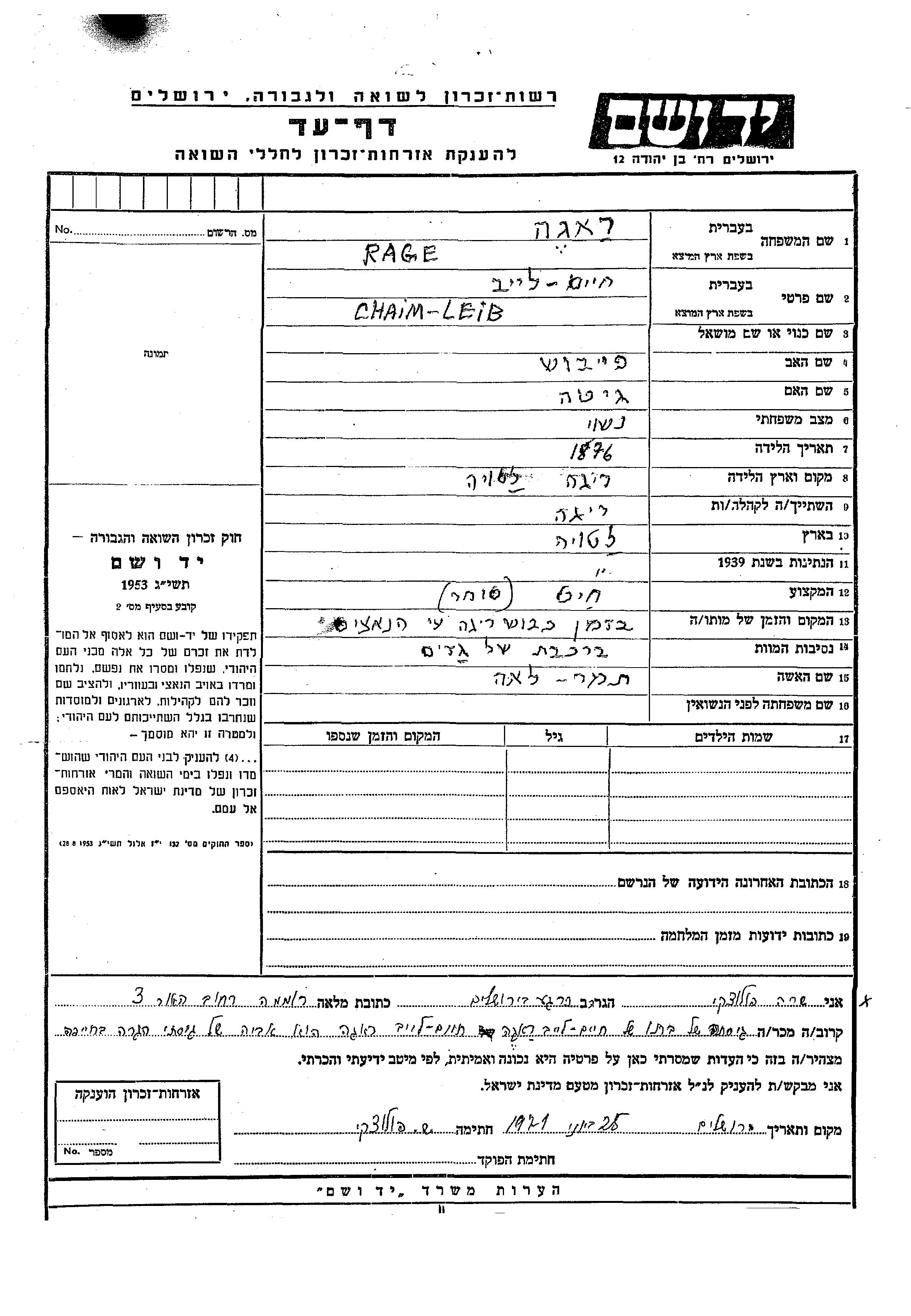 Khaim Leib Rage est né à Riga, Lettonie en 1876, fils de Feibush et de Gita. Il était Commerçant/e et Mariée à Lea Tamar. Avant la seconde guerre mondiale il vivait à Lettonie. Au cours de la guerre, il était à Lettonie.