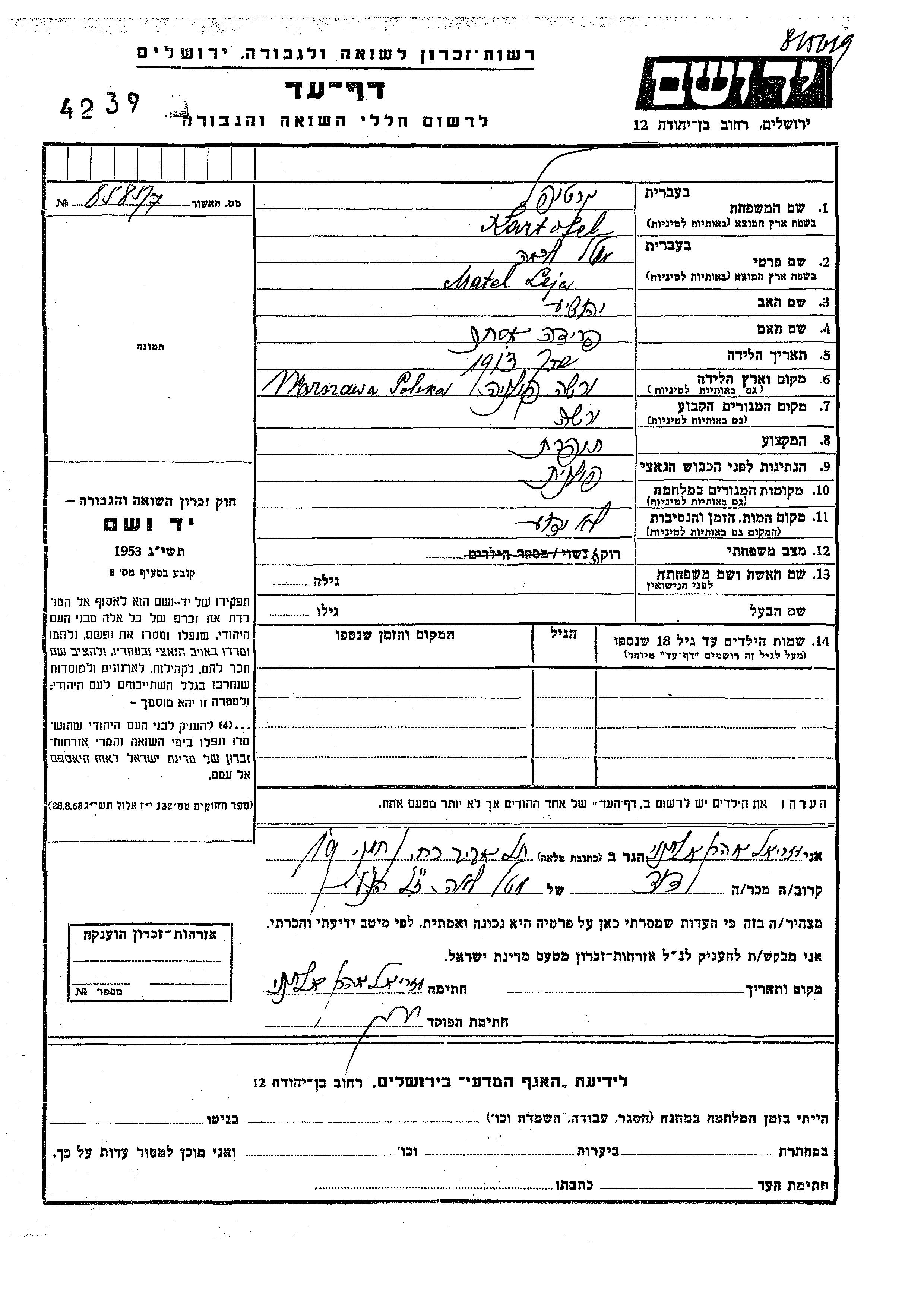Matel Leja Kartofel est née à Warsaw, Pologne en 1913, fille de Yehoshua et de Frida Ester. Elle était Couturière et Célibataire. Avant la seconde guerre mondiale elle vivait à Warsaw, Pologne.