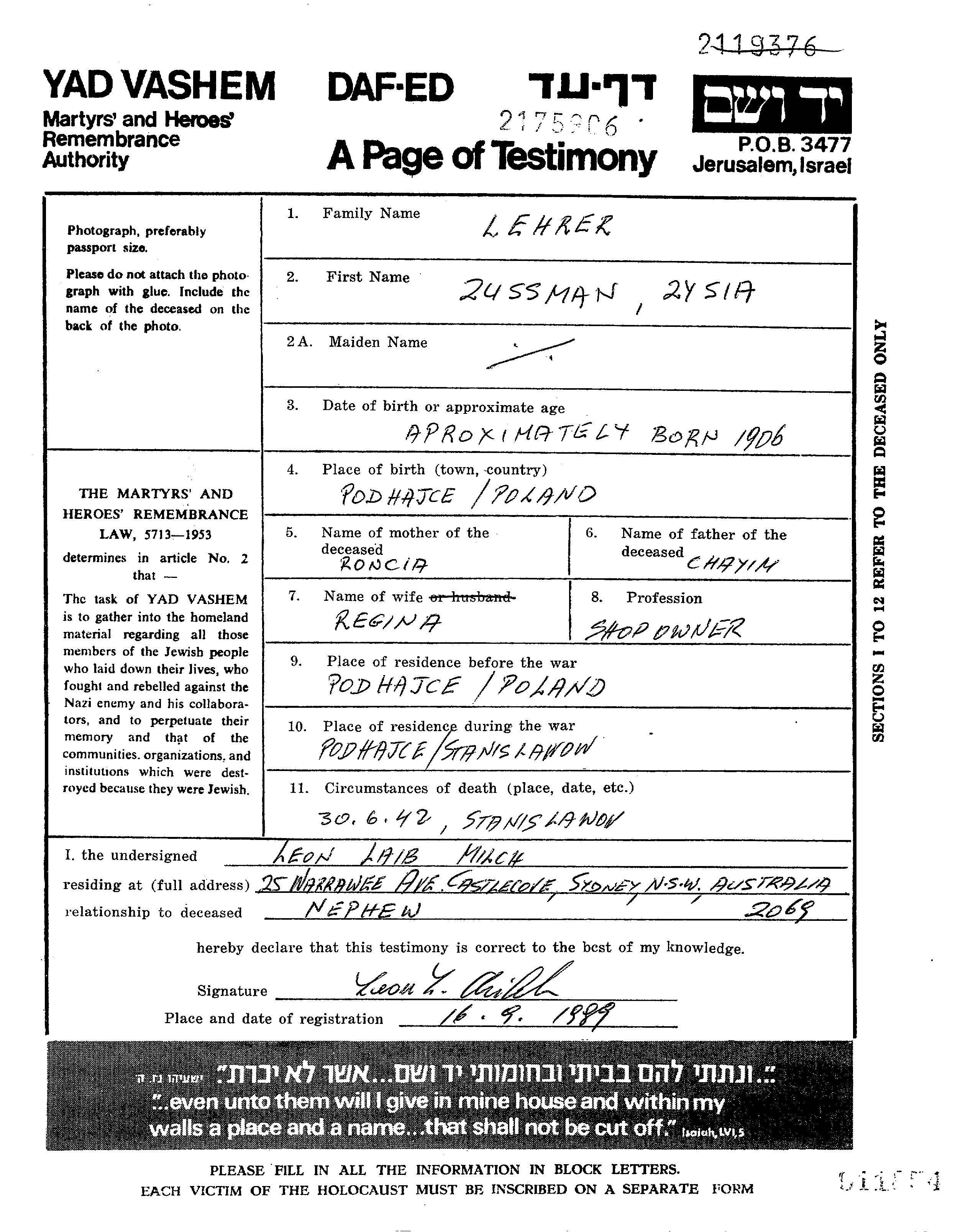Lehrer | Zysio | 1907 | Stanislawow, Pologne | Feuille de témoignage |
