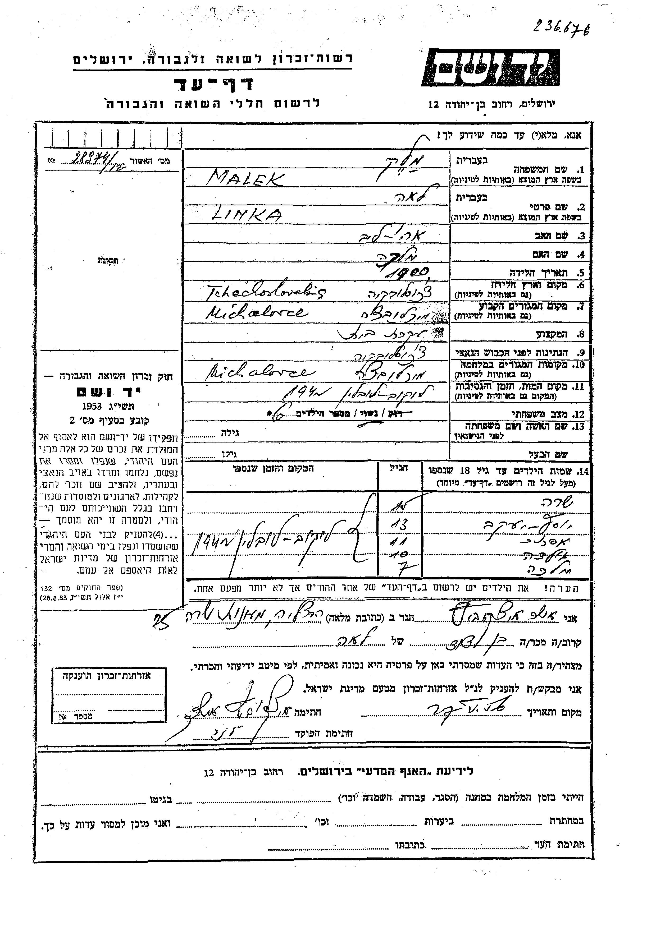 Linka Lea Malek est née à Tchécoslovaquie en 1900, fille de Arie Leib et de Malka. Elle était Femme au foyer et Mariée. Avant la seconde guerre mondiale elle vivait à Michalovce, Tchécoslovaquie. Pendant la guerre, elle était à Michalovce, Tchécoslovaquie.