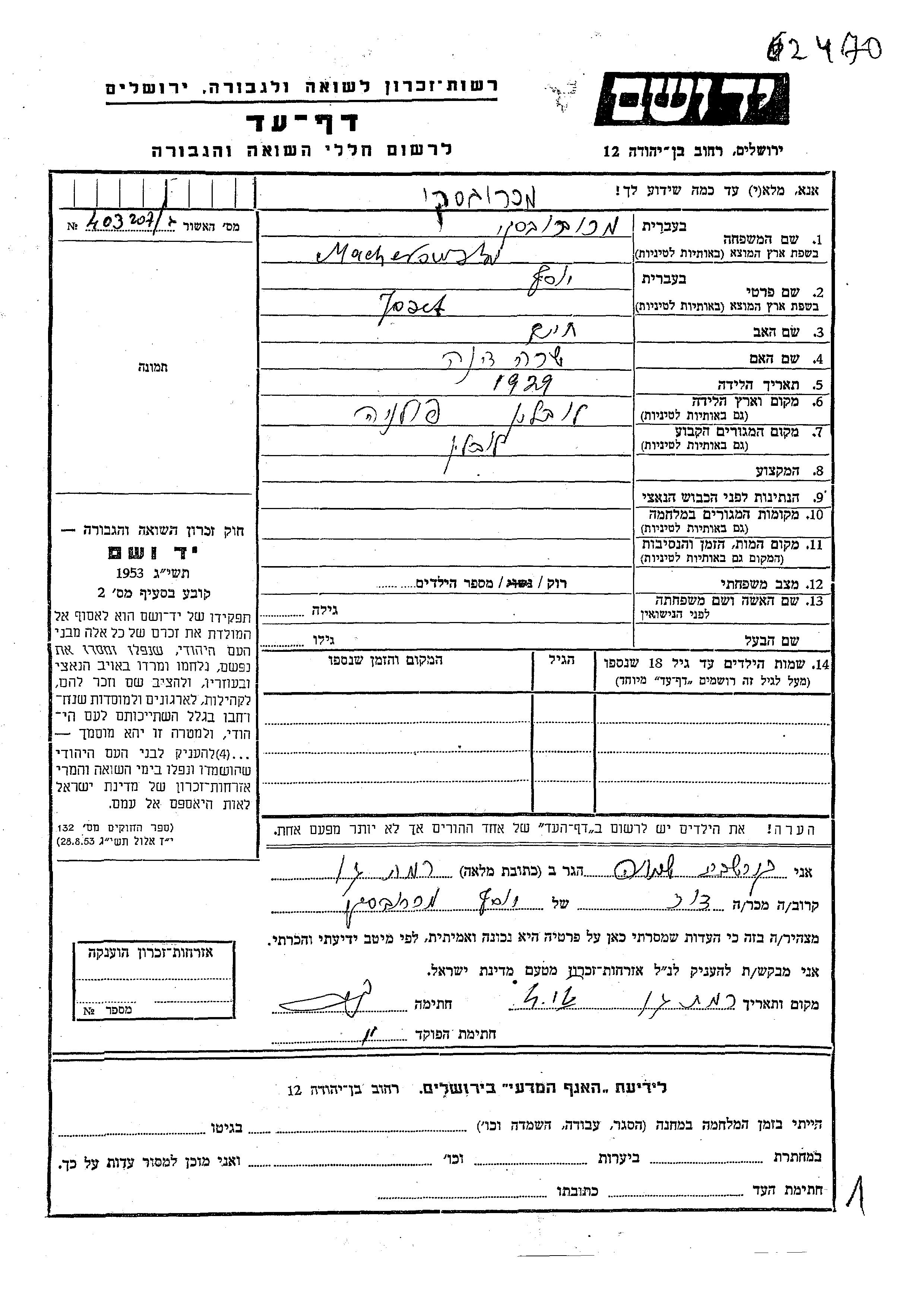 Josef Macherowski est né à Lublin, Pologne en 1929, fils de Khaim et de Sara Dina. Il était Célibataire. Avant la seconde guerre mondiale il vivait à Lublin, Pologne.