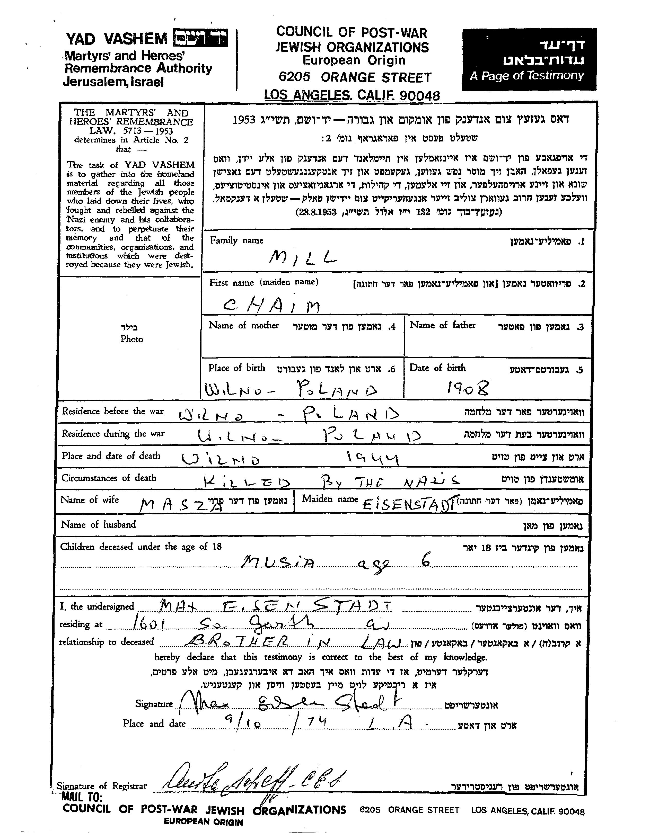 Mill Chaim 1908 Wilno, Pologne Feuille de témoignage