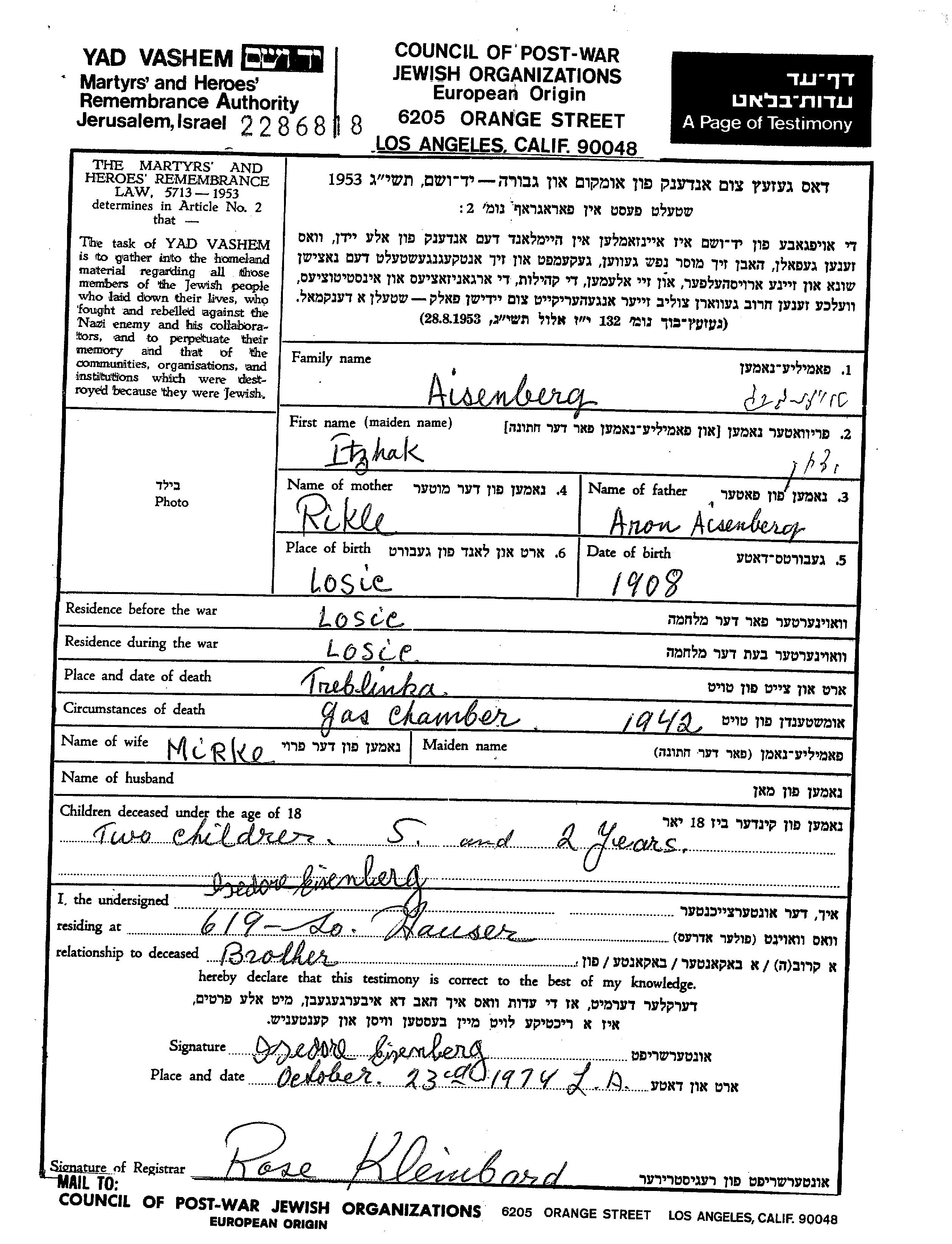 Aisenberg Isedore Losice, Pologne Feuille de témoignage