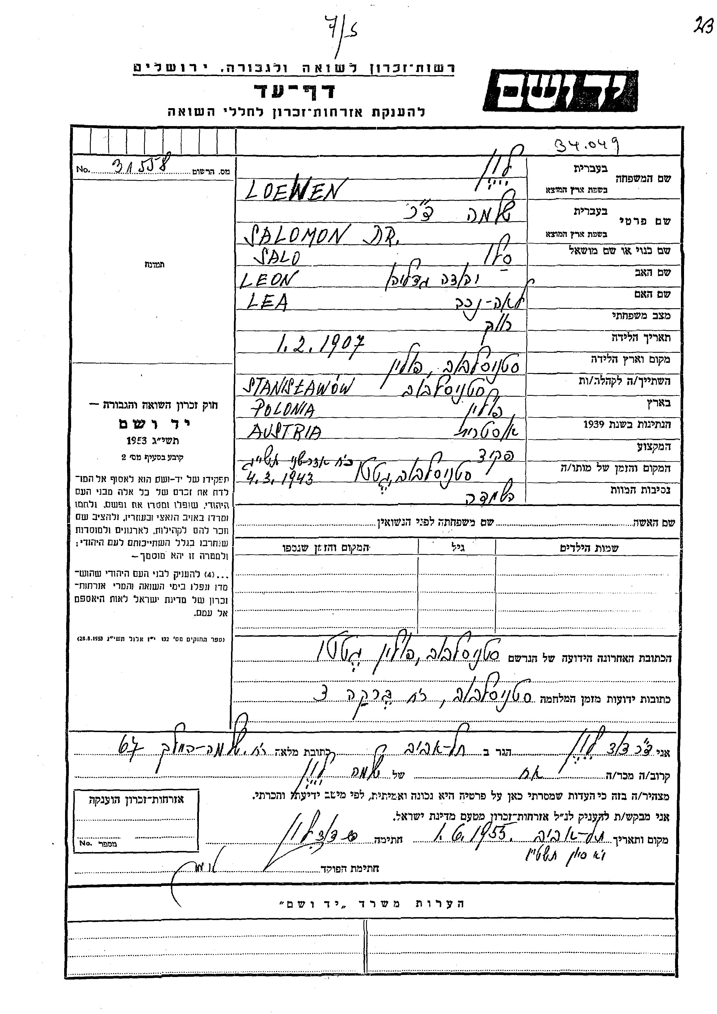 Loewen Salomon 1907 Stanislawow, Pologne Feuille de témoignage