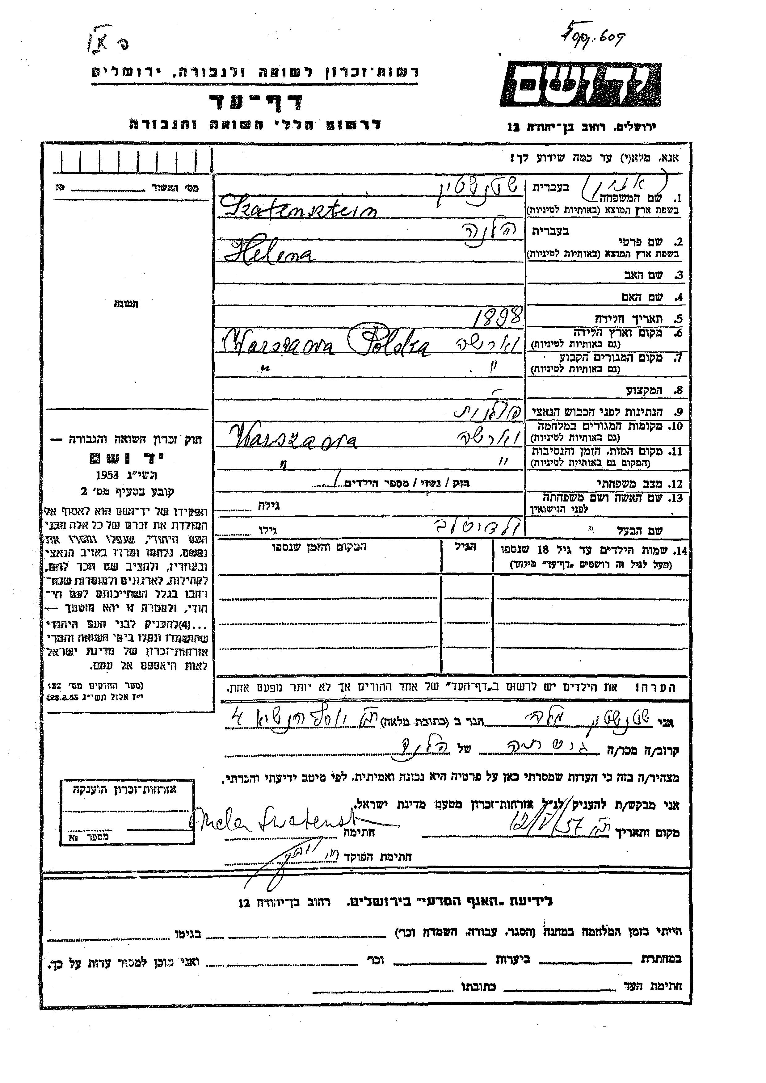 Szatensztein Helena 1898 Warszawa, Pologne Feuille de témoignage