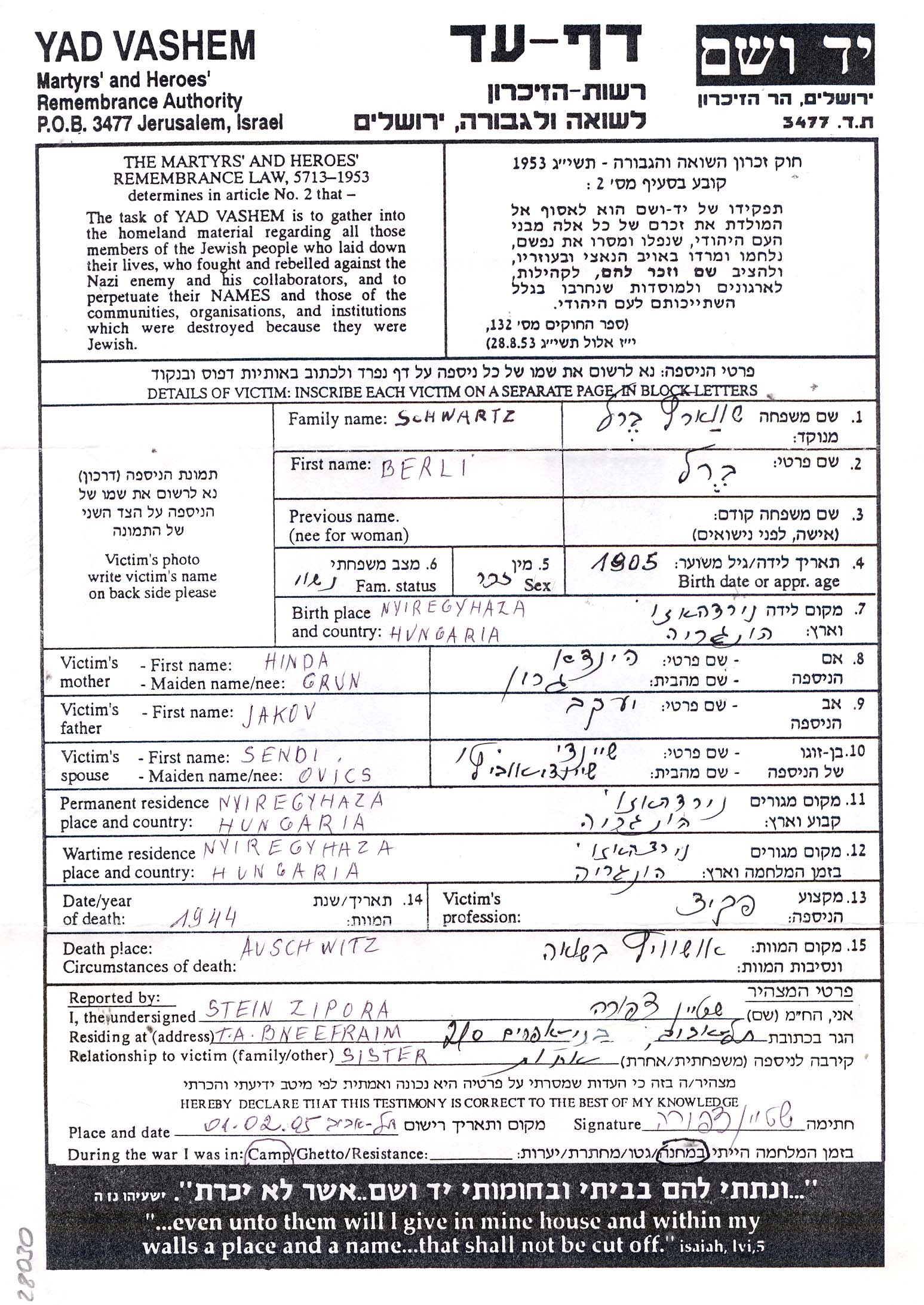 Berl Schwartz est né à Nyiregyhaza, Hongrie en 1905, fils de Yaakov et de Hinda. Il était Employé/e de bureau et Mariée à Sheina née Ovich. Avant la seconde guerre mondiale il vivait à Nyiregyhaza, Hongrie. Au cours de la guerre, il était à Nyiregyhaza, Hongrie.