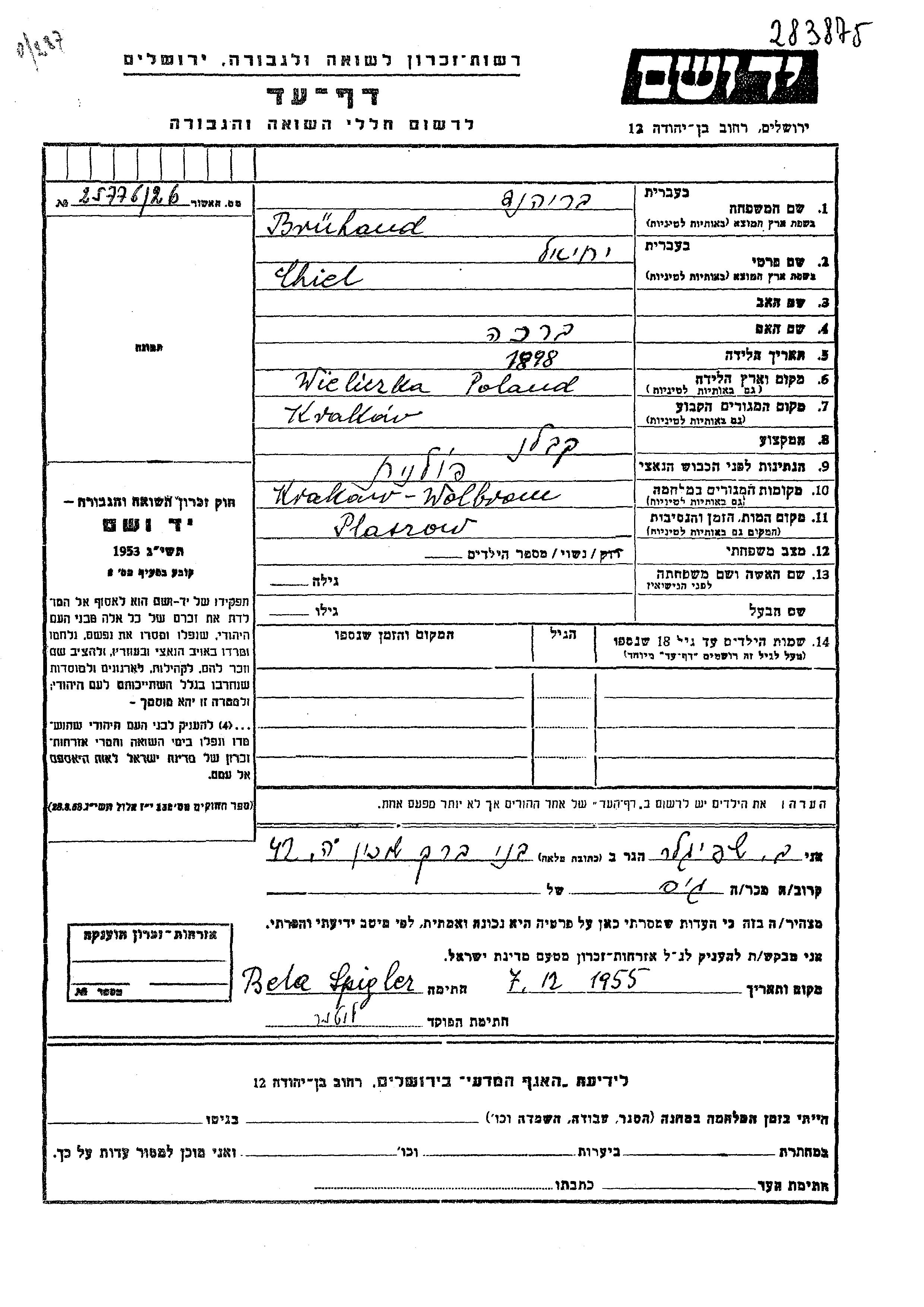 Bruehand Chiel 1898 Krakow, Pologne Feuille de témoignage