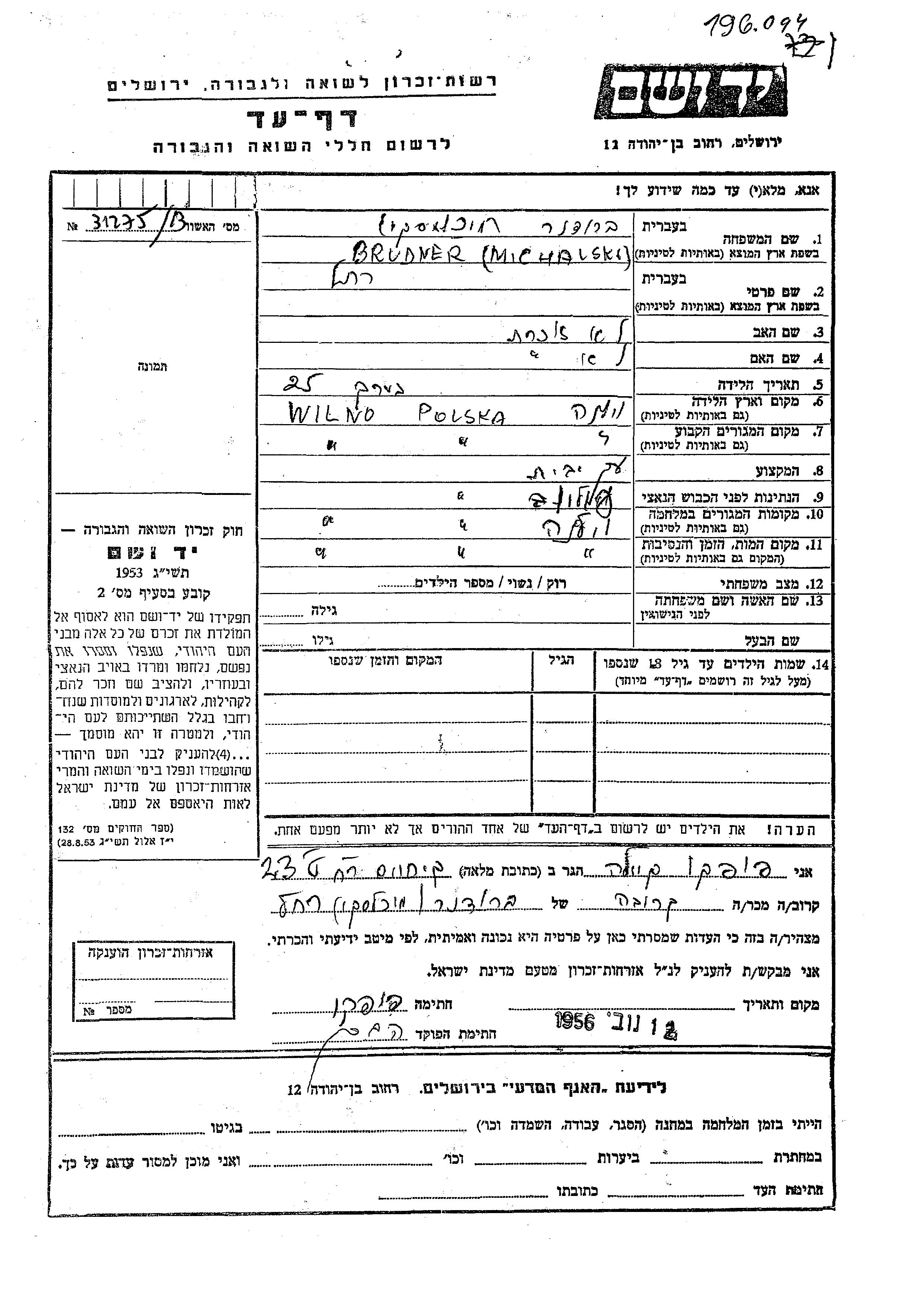 Michalski Brudner Rakhel Wilno, Pologne Feuille de témoignage