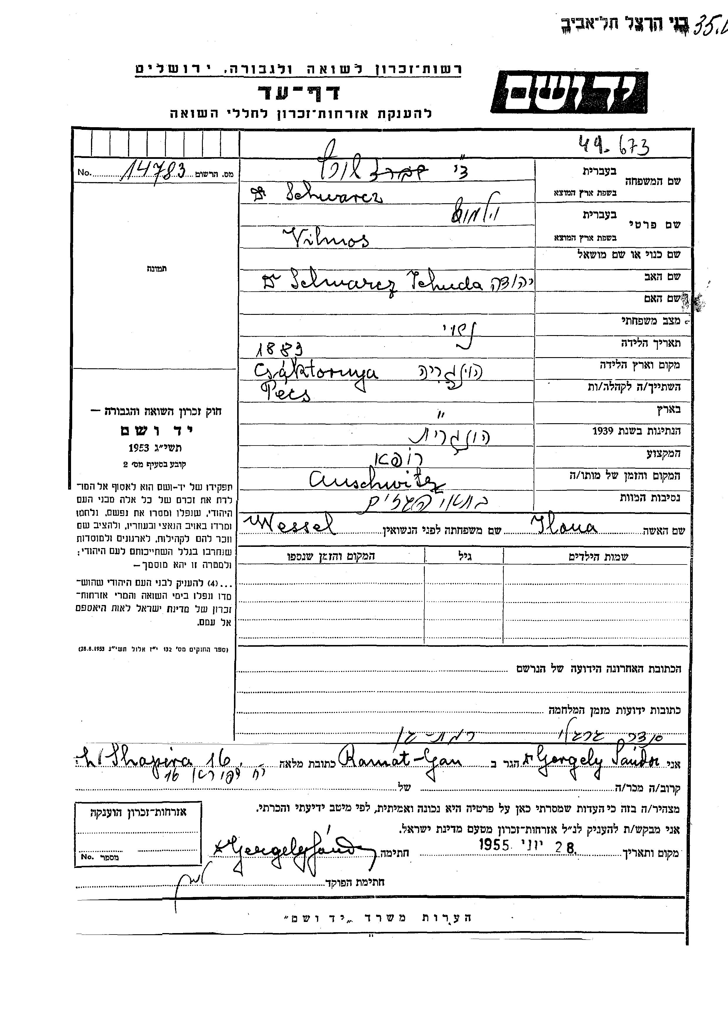 Dr. Vilmosh Shvartz est né à Csaktornya, Yugoslavie en 1883, fils de Yehuda. Il était Médecin et Mariée à Ilona née Wessel. Avant la seconde guerre mondiale il vivait à Pecs, Hongrie.