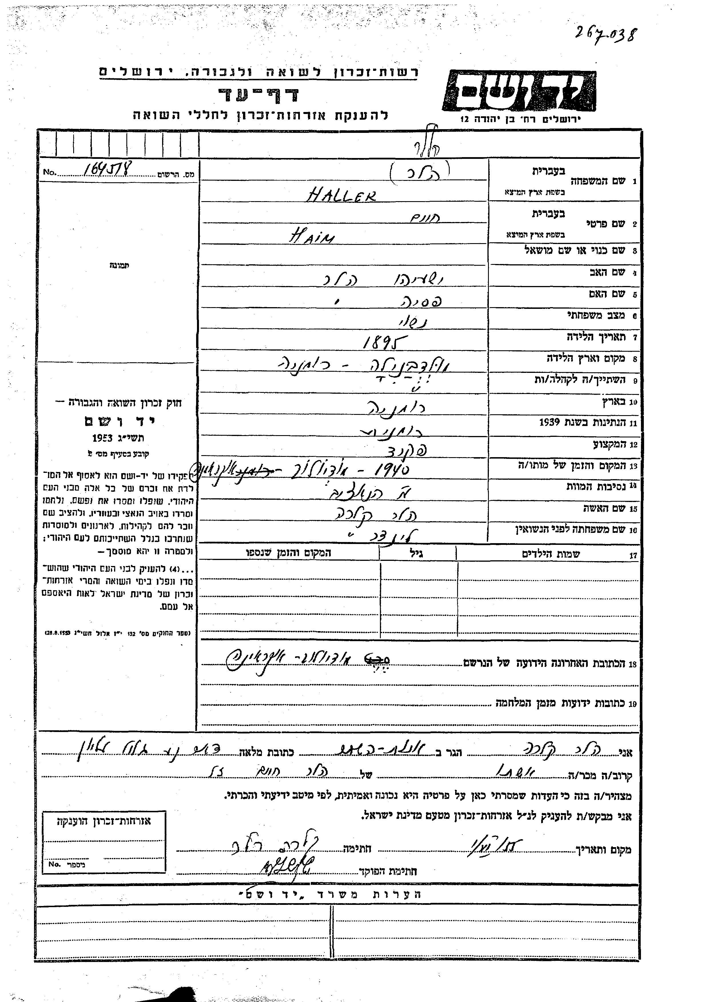 Haller Heler Haim 1895 endroit inconnu, Feuille de témoignage