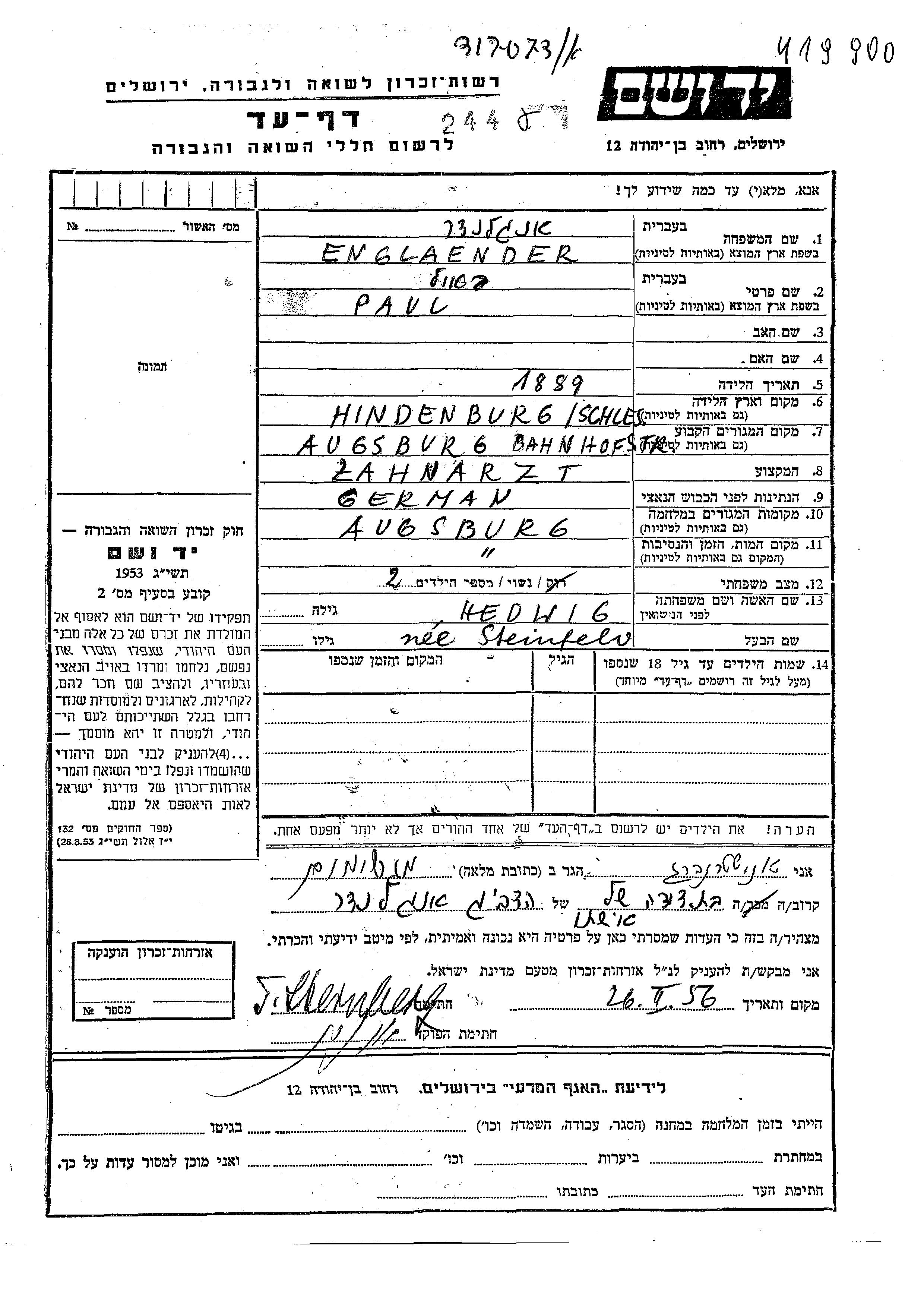Englaender Paul 1889 Augsburg, Allemagne Feuille de témoignage